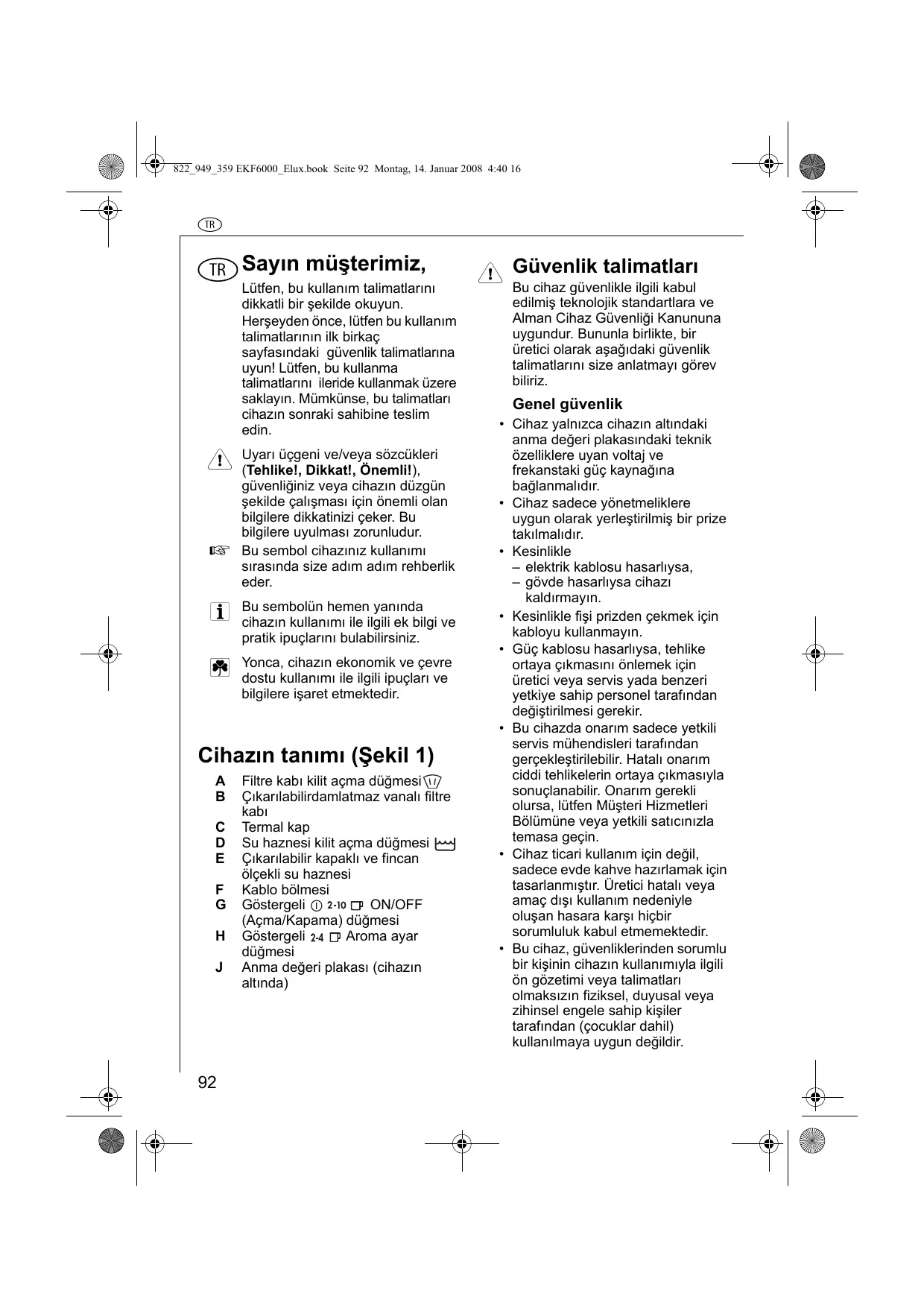Filtre kabı kilit açma düğmesi Çıkarılabilirdamlatmaz vanalı filtre kabı Termal kap Su haznesi kilit açma düğmesi Çıkarılabilir kapaklı ve fincan ölçekli su haznesi Kablo bölmesi Göstergeli ON/OFF (Açma/Kapama) düğmesi Göstergeli Aroma ayar düğmesi Anma değeri plakası (cihazın altında) 1 Güvenlik talimatları Bu cihaz güvenlikle ilgili kabul edilmiş teknolojik standartlara ve Alman Cihaz Güvenliği Kanununa uygundur. Bununla birlikte, bir üretici olarak aşağıdaki güvenlik talimatlarını size anlatmayı görev biliriz. Genel güvenlik