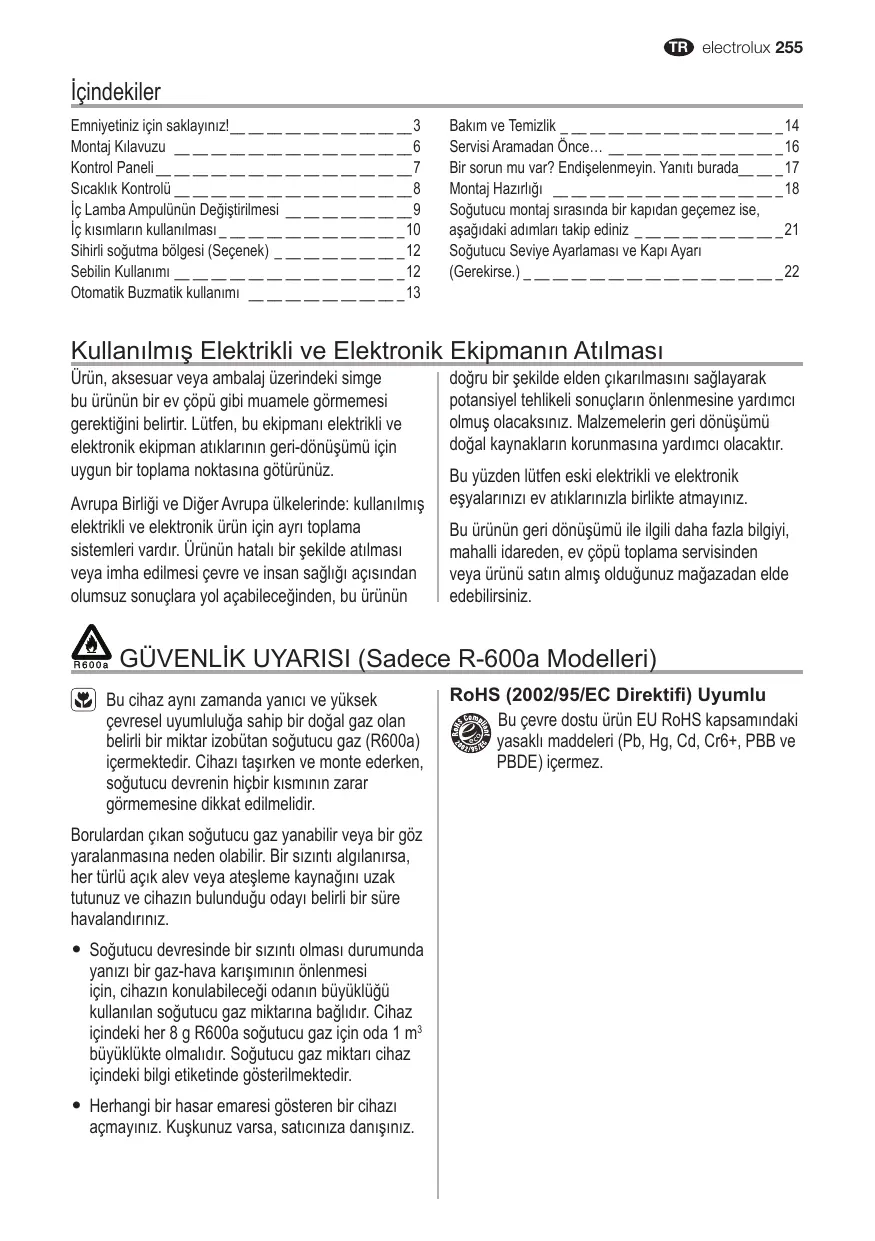 - Compruebe que no haya escapes en el sistema de suministro de agua (tubos y conectores). Vuelva a colocar los tubos y no mueva el frigorífico. Tap Connector Grifo Conector TuboTube del agua Water TR electrolux 255 İçindekiler Emniyetiniz için saklayınız!__ __ __ __ __ __ __ __ __ __3 Montaj Kılavuzu __ __ __ __ __ __ __ __ __ __ __ __ __6 Kontrol Paneli __ __ __ __ __ __ __ __ __ __ __ __ __ __7 Sıcaklık Kontrolü __ __ __ __ __ __ __ __ __ __ __ __ __8 İç Lamba Ampulünün Değiştirilmesi __ __ __ __ __ __ __9 İç kısımların kullanılması _ __ __ __ __ __ __ __ __ __ _10 Sihirli soğutma bölgesi (Seçenek) _ __ __ __ __ __ __ _12 Sebilin Kullanımı __ __ __ __ __ __ __ __ __ __ __ __ _12 Otomatik Buzmatik kullanımı __ __ __ __ __ __ __ __ _13 Bakım ve Temizlik _ __ __ __ __ __ __ __ __ __ __ __ _14 Servisi Aramadan Önce… __ __ __ __ __ __ __ __ __ _16 Bir sorun mu var? Endişelenmeyin. Yanıtı burada__ __ _17 Montaj Hazırlığı __ __ __ __ __ __ __ __ __ __ __ __ _18 Soğutucu montaj sırasında bir kapıdan geçemez ise, aşağıdaki adımları takip ediniz _ __ __ __ __ __ __ __ _21 Soğutucu Seviye Ayarlaması ve Kapı Ayarı (Gerekirse.) _ __ __ __ __ __ __ __ __ __ __ __ __ __ _22 Kullanılmış Elektrikli ve Elektronik Ekipmanın Atılması Ürün, aksesuar veya ambalaj üzerindeki simge bu ürünün bir ev çöpü gibi muamele görmemesi gerektiğini belirtir. Lütfen, bu ekipmanı elektrikli ve elektronik ekipman atıklarının geri-dönüşümü için uygun bir toplama noktasına götürünüz. Avrupa Birliği ve Diğer Avrupa ülkelerinde: kullanılmış elektrikli ve elektronik ürün için ayrı toplama sistemleri vardır. Ürünün hatalı bir şekilde atılması veya imha edilmesi çevre ve insan sağlığı açısından olumsuz sonuçlara yol açabileceğinden, bu ürünün doğru bir şekilde elden çıkarılmasını sağlayarak potansiyel tehlikeli sonuçların önlenmesine yardımcı olmuş olacaksınız. Malzemelerin geri dönüşümü doğal kaynakların korunmasına yardımcı olacaktır. Bu yüzden lütfen eski elektrikli ve elektronik eşyalarınızı ev atıklarınızla birlikte atmayınız. Bu ürünün geri dönüşümü ile ilgili daha fazla bilgiyi, mahalli idareden, ev çöpü toplama servisinden veya ürünü satın almış olduğunuz mağazadan elde edebilirsiniz. GÜVENLİK UYARISI (Sadece R-600a Modelleri) Bu cihaz aynı zamanda yanıcı ve yüksek çevresel uyumluluğa sahip bir doğal gaz olan belirli bir miktar izobütan soğutucu gaz (R600a) içermektedir. Cihazı taşırken ve monte ederken, soğutucu devrenin hiçbir kısmının zarar görmemesine dikkat edilmelidir. Borulardan çıkan soğutucu gaz yanabilir veya bir göz yaralanmasına neden olabilir. Bir sızıntı algılanırsa, her türlü açık alev veya ateşleme kaynağını uzak tutunuz ve cihazın bulunduğu odayı belirli bir süre havalandırınız.
