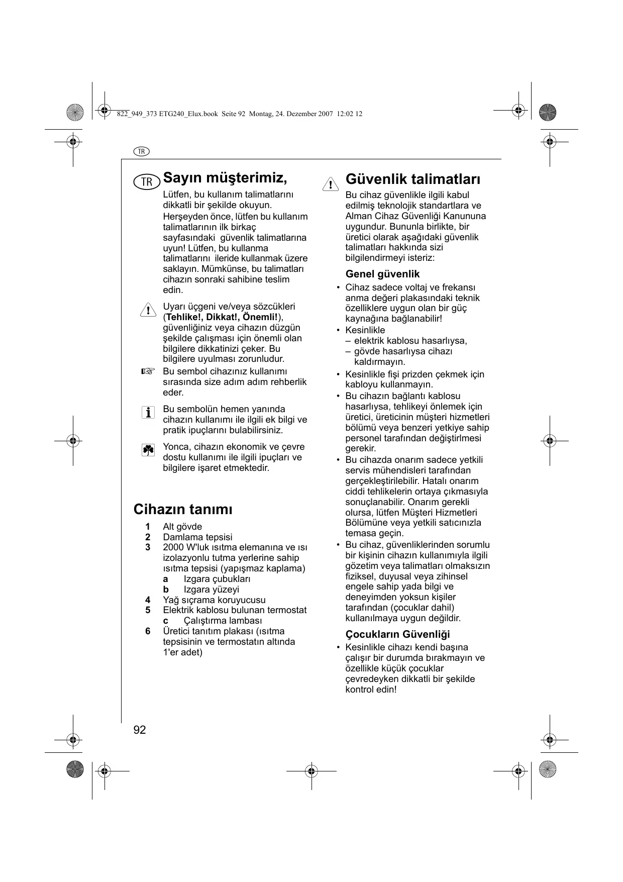 - Kesinlikle cihazı kendi başına çalışır bir durumda bırakmayın ve özellikle küçük çocuklar çevredeyken dikkatli bir şekilde kontrol edin! 822_949_373 ETG240_Elux.book Seite 93 Montag, 24. Dezember 2007 12:02 12