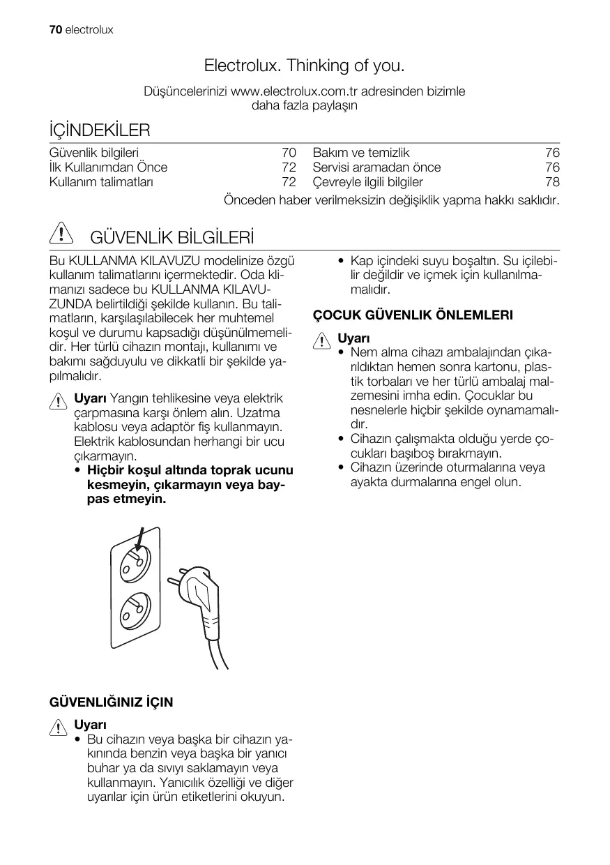 70 electrolux Electrolux. Thinking of you. Düsüncelerinizi www.electrolux.com.tr adresinden bizimle daha fazla paylasin IGINDEKILER Güventik bilgileri 70 Bakim ve temizlik 76 Ïk Kullanimdan Once 72. Servisi aramadan ônce 76 Kullanim talimatlar 72 Gevreyle ilgili bilgiler 78 Ônceden haber verilmeksizin deÿisikliik yapma hakki sakldir. L\ GÜVENLK BiLGILERI Bu KULLANMA KILAVUZU modelinize ôzgü + Kapiçindeki suyu bosaltin. Su içilebi- kullanim talimatlanni isermektedir. Oda kli- lir degildir ve igmek için kullanilma- manizi sadece bu KULLANMA KILAVU- malidir.. ZUNDA belirtildigi sekilde kullanin. Bu tali- … = matlann, karsilasilabilecek her muhtemel GÇOCUK GÜVENLIK ONLEMLERI kosul ve durumu kapsadià: düsünülmemeli- dir. Her türlü cihazin montaj, kullanimi ve bakimi saÿduyulu ve dikkatli bir sekilde ya- ñ\ Uyari + _Nem alma cihazi ambalajndan çika- nidiktan hemen sonra kartonu, plas- piimalidir. tik torbalan ve her türlü ambalaj mal- /À\ Uyani Yangin tehlkesine veya elektrik zemesini imha edin. Çocuklar bu çarpmasina karsi ônlem alin. Uzatma nesnelerle hiçbir sekilde oynamamali- kablosu veya adaptôr fis kullanmayin. dir. Elektrik kablosundan herhangi bir ucu + Cihazin çalismakta oldugu yerde ço- cikarmayin. cuklari basibos birakmayin.