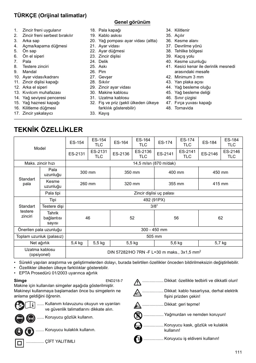 • Guide-chaîne • Huile de chaîne REMARQUE : • Certains éléments de la liste peuvent être inclus en tant qu’accessoires standard dans le coffret de l’outil envoyé. Ils peuvent varier suivant les pays. Bruit ENG905-1 Les niveaux de bruit pondéré A typiques ont été mesurés selon la norme EN60745 : Niveau de pression sonore (LpA) : 90,8 dB (A) • Selon la manière dont l’outil est utilisé, il est possible que l’émission des vibrations pendant l’utilisation réelle de l’outil électrique diffère de la valeur de l’émission déclarée. • Veillez à identifier les mesures de sécurité destinées à protéger l’opérateur et établies en fonction de l’estimation de l’exposition dans les conditions réelles d’utilisation (en prenant en compte toutes les étapes du cycle de fonctionnement, telles que les périodes de mise hors tension de l’outil, les périodes de fonctionnement au ralenti et les périodes de mise en route). Pour les pays d’Europe uniquement ENH024-8 Déclaration de conformité CE Le soussigné, Rainer Bergfeld, tel qu’autorisé par Dolmar GmbH, déclare que les machines DOLMAR suivantes : Nom de la machine : Tronçonneuse N° de modèle/Type : ES-154, ES-154 TLC, ES-164, ES-164 TLC, ES-174, ES-174 TLC, ES-184, ES-184 TLC, ES-2131, ES-2131 TLC, ES-2136, ES-2136 TLC, • Het netsnoer en de stekker niet beschadigd zijn; Raadpleeg het hoofdstuk “CONTROLES”. 2. Zorg er met name altijd voor dat het gebruikte verlengsnoer de juiste dwarsdoorsnede heeft (zie “TECHNISCHE GEGEVENS”). Bij gebruik van een kabelhaspel moet u het snoer helemaal uitrollen. Bij gebruik van de kettingzaag in de open lucht, controleert u dat het gebruikte snoer geschikt is voor gebruik in de open lucht en als zodanig is gemarkeerd. 5. Controleer de richting van de zaagketting. De pijlmarkering op de zaagketting toont de richting van de ketting (zie afb. 12). 6. Leg een uiteinde van de zaagketting rond de voorkant van het zaagblad en het andere uiteinde rondom het kettingwiel. 7. Plaats het zaagblad op de kettingzaag. 8. Lijn de spanschuif uit met de opening in het zaagblad (zie afb. 13). 9. Houd het zaagblad vast en draai de stelschroef/-knop voor de zaagketting om de spanning van de zaagketting in te stellen. 10. Plaats de afdekking van het kettingwiel zodanig dat de haken langs de openingen liggen en de pen in de bus van de afdekking van het kettingwiel valt (zie afb. 14). 11. Zet de afdekking van het kettingwiel vast (zie afb. 15 en 16).