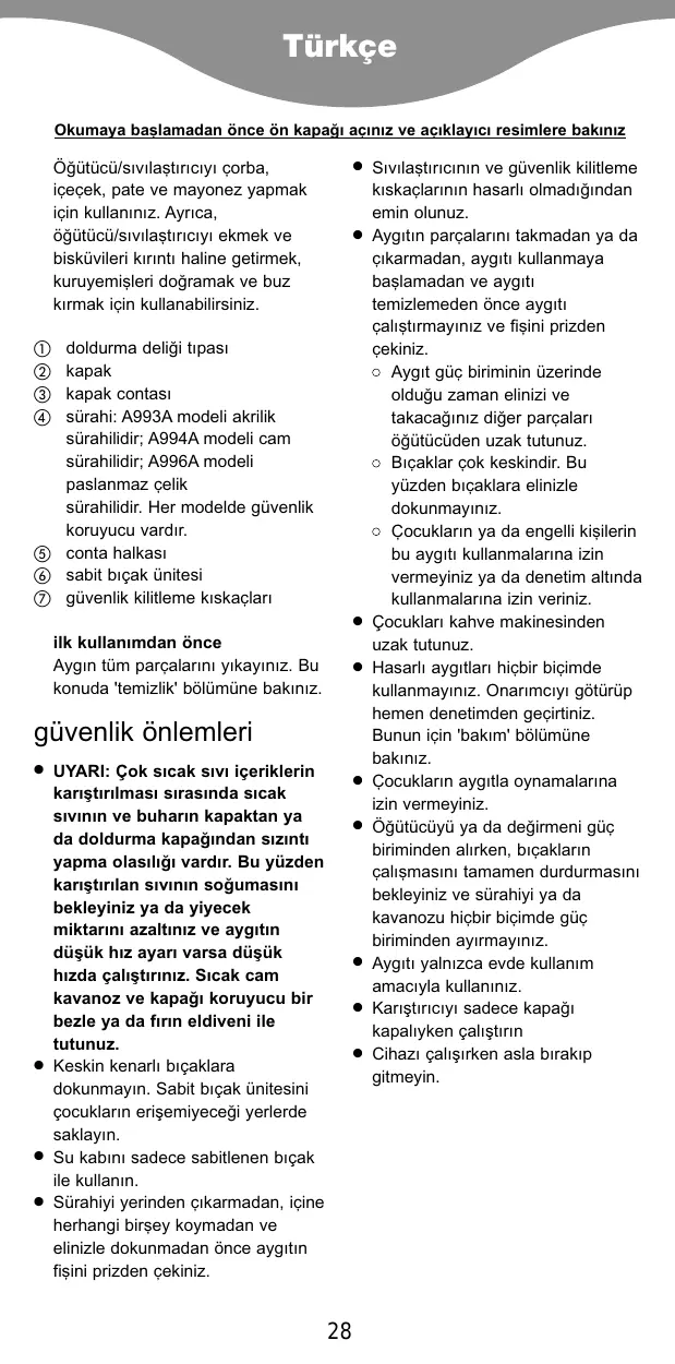 UYARI: Çok sıcak sıvı içeriklerin karıştırılması sırasında sıcak sıvının ve buharın kapaktan ya da doldurma kapağından sızıntı yapma olasılığı vardır. Bu yüzden karıştırılan sıvının soğumasını bekleyiniz ya da yiyecek miktarını azaltınız ve aygıtın düşük hız ayarı varsa düşük hızda çalıştırınız. Sıcak cam kavanoz ve kapağı koruyucu bir bezle ya da fırın eldiveni ile tutunuz. Keskin kenarlı bıçaklara dokunmayın. Sabit bıçak ünitesini çocukların erişemiyeceği yerlerde saklayın. Su kabını sadece sabitlenen bıçak ile kullanın. Sürahiyi yerinden çıkarmadan, içine herhangi bir…ey koymadan ve elinizle dokunmadan önce aygıtın fi…ini prizden çekiniz.