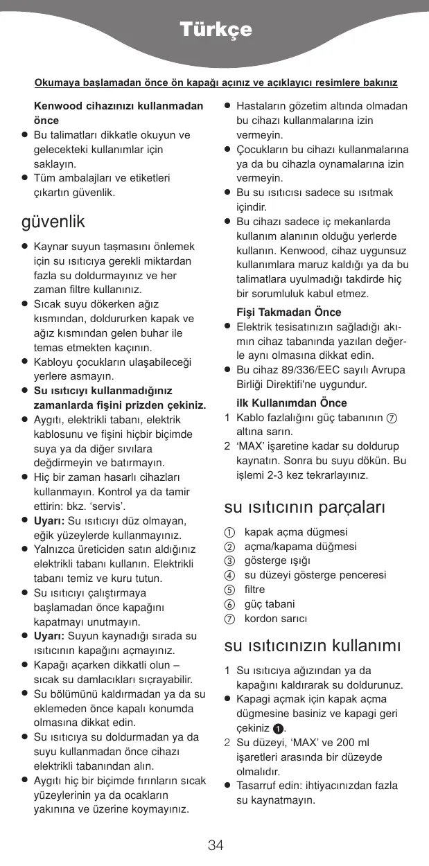 Hastaların gözetim altında olmadan bu cihazı kullanmalarına izin vermeyin. Çocukların bu cihazı kullanmalarına ya da bu cihazla oynamalarına izin vermeyin. Bu su ısıtıcısı sadece su ısıtmak içindir. Bu cihazı sadece iç mekanlarda kullanım alanının olduğu yerlerde kullanın. Kenwood, cihaz uygunsuz kullanımlara maruz kaldığı ya da bu talimatlara uyulmadığı takdirde hiç bir sorumluluk kabul etmez. Fifli Takmadan Önce Elektrik tesisat›n›z›n sa¤lad›¤› ak›m›n cihaz taban›nda yaz›lan de¤erle ayn› olmas›na dikkat edin. Bu cihaz 89/336/EEC say›l› Avrupa Birli¤i Direktifi'ne uygundur. ilk Kullan›mdan Önce 1 Kablo fazlalığını güç tabanının altına sarın. 2 ‘MAX’ iflaretine kadar su doldurup kaynat›n. Sonra bu suyu dökün. Bu i…lemi 2-3 kez tekrarlayınız. su ısıtıcının parçaları kapak açma dügmesi açma/kapama düğmesi gösterge ışığı su düzeyi gösterge penceresi filtre güç tabani kordon sarıcı su ısıtıcınızın kullanımı 1 Su ısıtıcıya ağızından ya da kapağını kaldırarak su doldurunuz. ● Kapagi açmak için kapak açma dügmesine basiniz ve kapagi geri çekiniz . 2 Su düzeyi, ‘MAX’ ve 200 ml işaretleri arasında bir düzeyde olmalıdır. ● Tasarruf edin: ihtiyac›n›zdan fazla su kaynatmay›n.