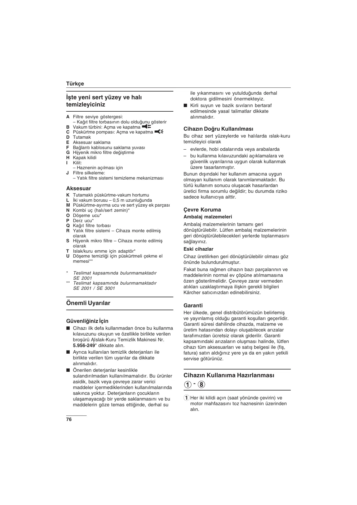 ile yýkanmasýný ve yutulduðunda derhal doktora gidilmesini önermekteyiz. ■ Kirli suyun ve bazik sývýlarýn bertaraf edilmesinde yasal talimatlar dikkate alýnmalýdýr. Cihazýn Doðru Kullanýlmasý Bu cihaz sert yüzeylerde ve halýlarda ýslak-kuru temizleyici olarak evlerde, hobi odalarýnda veya arabalarda bu kullanma kýlavuzundaki açýklamalara ve güvenlik uyarýlarýna uygun olarak kullanmak üzere tasarlanmýþtýr. Bunun dýþýndaki her kullaným amacýna uygun olmayan kullaným olarak tanýmlanmaktadýr. Bu türlü kullaným sonucu oluþacak hasarlardan üretici firma sorumlu deðildir; bu durumda riziko sadece kullanýcýya aittir. Çevre Koruma Ambalaj malzemeleri Ambalaj malzemelerinin tamamý geri dönüþtürülebilir. Lütfen ambalaj malzemelerinin geri dönüþtürülebilecekleri yerlerde toplanmasýný saðlayýnýz. Eski cihazlar Cihaz üretilirken geri dönüþtürülebilir olmasý göz önünde bulundurulmuþtur. Fakat buna raðmen cihazýn bazý parçalarýnýn ve maddelerinin normal ev çöpüne atýlmamasýna özen gösterilmelidir. Çevreye zarar vermeden atýklarý uzaklaþtýrmaya iliþkin gerekli bilgileri Kärcher satýcýnýzdan edinebilirsiniz. Garanti Her ülkede, genel distribütörümüzün belirlemiþ ve yayýnlamýþ olduðu garanti koþullarý geçerlidir. Garanti süresi dahilinde cihazda, malzeme ve üretim hatasýndan dolayý oluþabilecek arýzalar tarafýmýzdan ücretsiz olarak giderilir. Garanti kapsamýndaki arýzalarýn oluþmasý halinde, lütfen cihazý tüm aksesuarlarý ve satýþ belgesi ile (fiþ, fatura) satýn aldýðýnýz yere ya da en yakýn yetkili servise götürünüz. Cihazýn Kullanýma Hazýrlanmasý Her iki kilidi açýn (saat yönünde çevirin) ve motor mahfazasýný toz haznesinin üzerinden alýn. Türkçe Her iki tekerleði, yerine oturana kadar mahfazadaki askýya bastýrýn. Her iki döner tekerleði mahfaza askýsýna bastýrýn. Aksesuar askýsýný, yerine oturana kadar içeriye bastýrýn. Kuru temizleme için kaðýt filtre torbasýný takýn. Motor mahfazasýný toz haznesine oturtun ve kilitleyin (kilitleri saatin aksi yönde, tespite kadar döndürün). Aksesuar Baðlanmasý Püskürtme-vakum hortumunu baðlayýn, oturduðu duyulmalýdýr. Püskürtme hortumunun kavramasýný takýn, oturduðu duyulmalýdýr. Püskürtme-vakum hortumuna veya vakum borularýna istenen aksesuarý takýn. Uyarý: Hangi aksesuarlarýn baðlanabileceði, kullanma þekline baðlýdýr. Bu konu ile ilgili olarak bu kýlavuzunun bir sonraki bölümünü okuyun. Cihazýn Kullanýlmasý kumaþýn cinsine baðlý olarak 6 - 9 ay süre ile yok edildiði ispat edilmiþtir. ■ Temizlikte sadece orijinal Kärcher RM 519 deterjan kullanýlmasýný önermekteyiz. Bu deterjan tüm tekstil temizleme iþlerinde kullanýlabilir. ■ Birlikte verilen deneme paketinin yarýsýný (veya 1/2 ölçü bardaðý RM 519) 5l suya karýþtýrýn ve bu karýþýmý temizlik maddesi kabýna doldurun. Çalýþmaya Baþlama