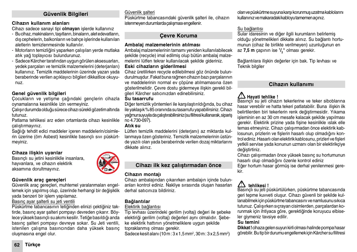 Türkçe Güvenlik åalteri Püskürtme tabancasndaki güvenlik åalteri ile, cihazn istenmeyen durumlarda çalåmas engellenir. Çevre Koruma Ambalaj malzemelerinin atlmas Ambalaj malzemelerinin tamam yeniden kullanlabilecek åekilde (recycle) imal edilmiå olup bütün ambalaj malzemelerini lütfen tekrar kullanlacak åekilde gideriniz. Eski cihazlarn giderilmesi Cihaz üretilirken recycle edilebilmesi göz önünde bulundurulmuådur. Fakat buna ramen cihazn baz parçalarnn ve maddelerinin normal ev çöpüne atlmamasna özen gösterilmelidir. Çevre dostu gidermeye iliåkin gerekli bilgileri Kärcher satcnzdan edinebilirsiniz. Su tasarrufu Dier temizlik yöntemleri ile karålaåtrldnda, bu cihaz ile yaklaåk % 85 orannda su tasarrufu yapabilirsiniz. Cihaz yamur suyuyla da çalåtrabilirsiniz (su filitresi kullanarak, sipariå no 4.730-097). Atk su Lütfen temizlik maddelerini (deterjan) az miktarda kullanmaya özen gösteriniz. Temizlik malzemelerinin üstünde yazl olan yada beraberinde verilen dozaj miktarlarn dikkate alnz. Cihaz ilk kez çalåtrmadan önce Cihazn montaj Cihaz ambalajndan çkarrken ambalajn içinde bulunanlar kontrol ediniz. Nakliye srasnda oluåan hasarlar derhal satcnza bildiriniz. Balantlar Elektirik balants Tip levhas üzerindeki gerilim (voltaj) deeri ile åebeke elektirii gerilim (voltaj) deerleri ayn olmaldr. Åebeke elektirik hattnn yönetmeliklere uygun åekilde topraklanmå olmas gerekir. Sadece kesit alan (10 m : 3 x 1,5 mm2, 30 m : 3 x 2,5 mm2) olan ve püskürtme suyuna karå korunmuå uzatma kablolarn kullannz ve makaradaki kabloyu tamemen açnz. Su balants Sular idaresinin ve dier ilgili kurumlarn belirlemiå olduu yönetmelikleri dikkate alnz. Su balant hortumunun (cihaz ile birlikte verilmeyen) uzunluunun en az 7,5 m çapnn ise 1/2" olmas gerekir. Balantlara iliåkin deerler için bak. Tip levhas ve Teknik bilgiler Cihazn kullanm ! Hayati tehlike ! Basnçl su jeti cihazn tekerlerine ve teker siboblarna hasar verebilir ve hatta tekeri patlatabilir. Buna iliåkin ilk belirtilerden biri tekerlerin renk deiåtirmesidir. Ykama iåleminin en az 30 cm mesafe kalacak åekilde yaplmas gerekir. Elektirik prizine yada fiåine kesinlikle slak elle temas etmeyiniz. Cihaz çalårmadan önce elektirik kablosunun, prizlerin ve fiålerin hasarl olup olmadn kontrol ediniz. Hasarl olan elektirik kablosunu, prizleri ve fiåleri yetkili servise yada konunun uzman olan bir elektirikçiye deiåtirtiniz. Cihaz çalårmadan önce yüksek basnç su hortumunun hasarl olup olmadn özenle kontrol ediniz Eer hortum hasar görmüå ise derhal yenilenmesi gerekir. ! tehlikesi ! Basnçl su jeti püskürtülürken, püskürtme tabancasnda geri tepme kuvveti oluåur. Cihaz güvenli bir åekilde kullanabilmek için püskürtme tabancasn ve namlusunu skca tutunuz. Çalårken sçrayan cisimlerden, parçalardan korunmak için ihtiyaca göre, gerektiinde koruyucu elbiseler giymeniz tavsiye edilir. Su temini Dikkat ! cihaza gelen suyun kirli olmas halinde pompa hasar görebilir. Bu tip bir durumu engellemek için Kärcher su filitresi (sipariå no 4.730-097) kullanlmas önemle tavsiye olunur. Yüksek basnçl temizlik cihazlarnn çalåtrld srada, cihazn su giriåinin kapal olmas halinde, silindir kafas hasar görebilir. Yüksek basnçl temizlik cihazlarn, musluk kapal iken kesinlikle çalåtrmaynz. Çalåma basncnn seçilmesi Yüksek basnç ayar: Memeyi konumuna gelecek åekilde çeviriniz. Düåük basnç ayar: Memeyi konumuna gelecek åekilde çeviriniz. Cihazn su balantsn, direk olarak åebeke suyundan yada açk kaplarda biriktirilmiå su ile salayabilirsiniz. Su temininin åebeke suyu ile yaplmas
