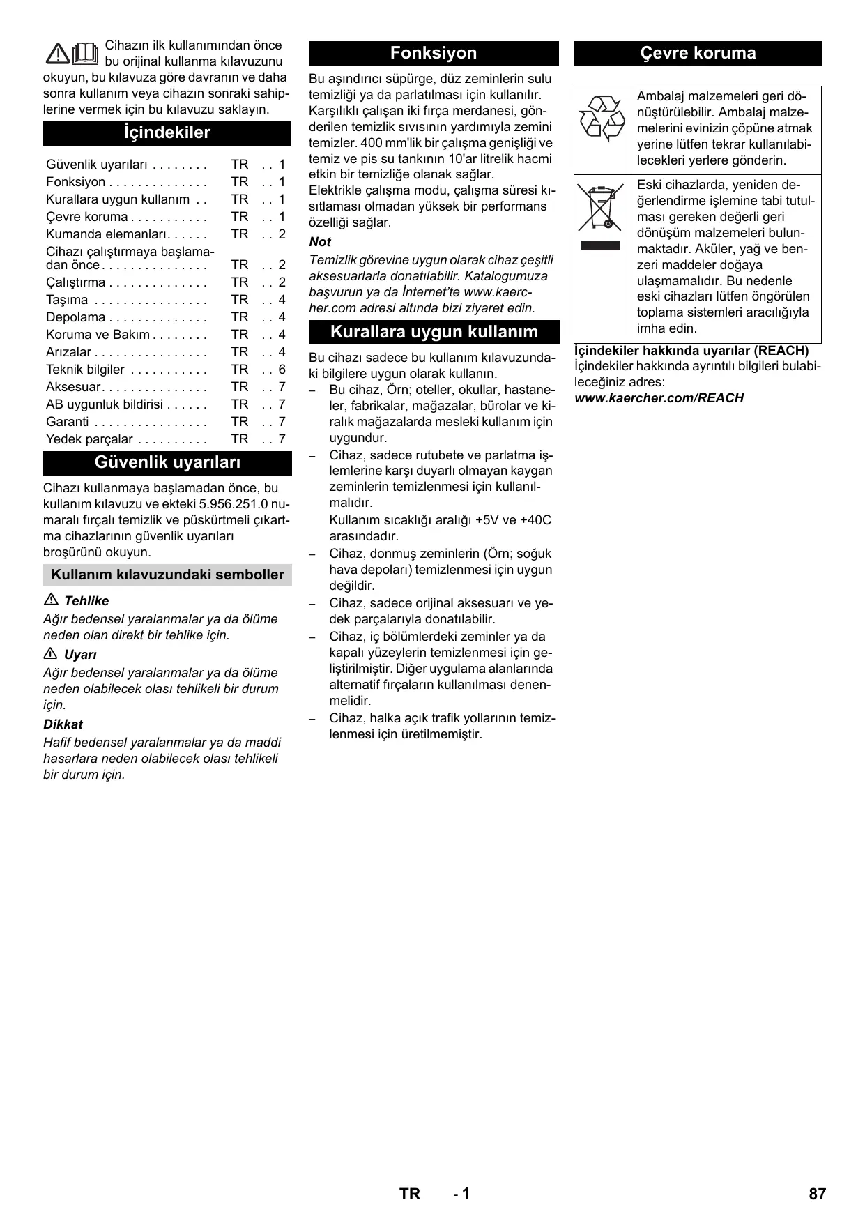 Çevre koruma Ambalaj malzemeleri geri dönüştürülebilir. Ambalaj malzemelerini evinizin çöpüne atmak yerine lütfen tekrar kullanılabilecekleri yerlere gönderin. Eski cihazlarda, yeniden değerlendirme işlemine tabi tutulması gereken değerli geri dönüşüm malzemeleri bulunmaktadır. Aküler, yağ ve benzeri maddeler doğaya ulaşmamalıdır. Bu nedenle eski cihazları lütfen öngörülen toplama sistemleri aracılığıyla imha edin. İçindekiler hakkında uyarılar (REACH) İçindekiler hakkında ayrıntılı bilgileri bulabileceğiniz adres: www.kaercher.com/REACH