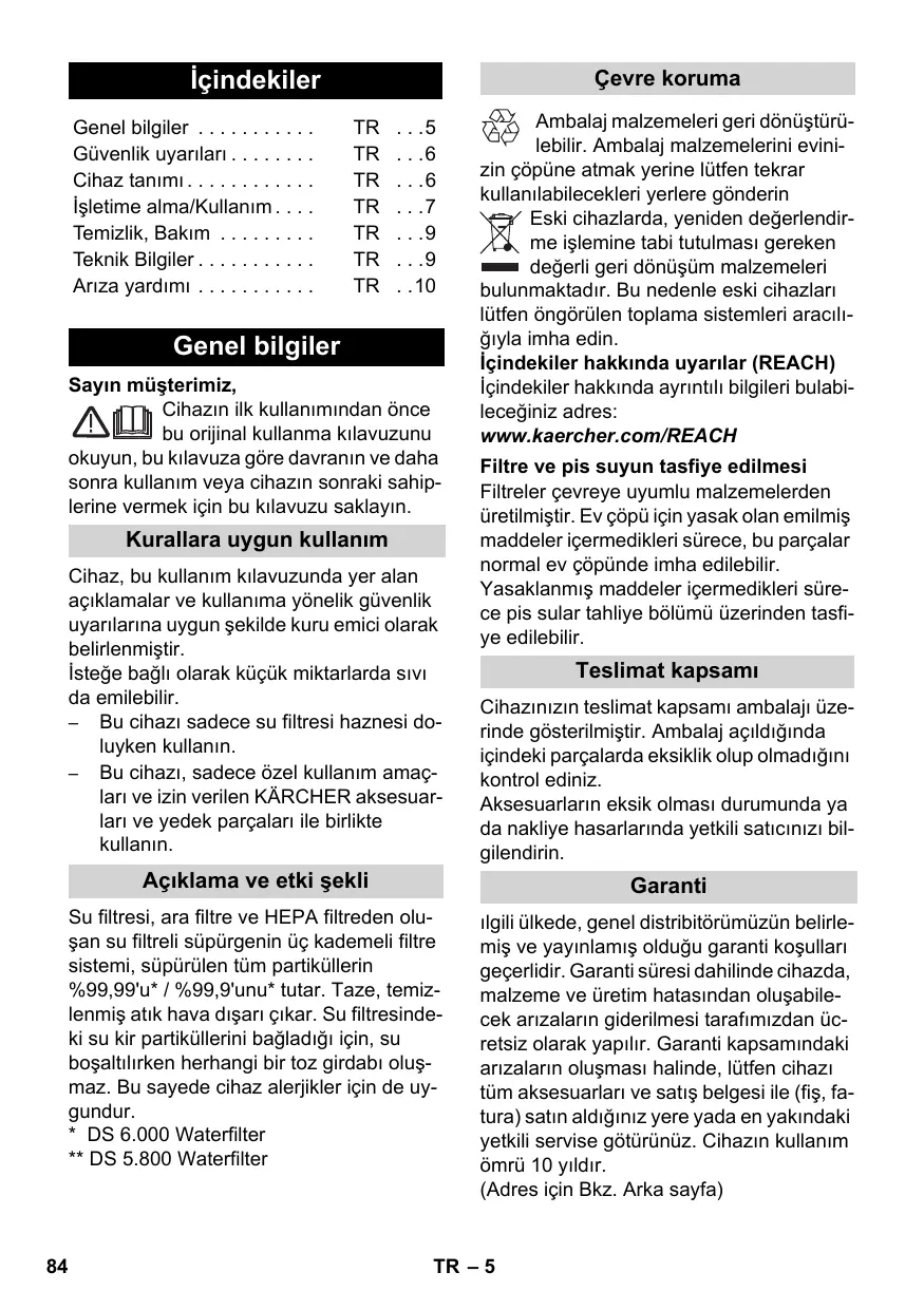 Ambalaj malzemeleri geri dönüştürülebilir. Ambalaj malzemelerini evinizin çöpüne atmak yerine lütfen tekrar kullanılabilecekleri yerlere gönderin Eski cihazlarda, yeniden değerlendirme işlemine tabi tutulması gereken değerli geri dönüşüm malzemeleri bulunmaktadır. Bu nedenle eski cihazları lütfen öngörülen toplama sistemleri aracılığıyla imha edin. İçindekiler hakkında uyarılar (REACH) İçindekiler hakkında ayrıntılı bilgileri bulabileceğiniz adres: www.kaercher.com/REACH Filtre ve pis suyun tasfiye edilmesi Filtreler çevreye uyumlu malzemelerden üretilmiştir. Ev çöpü için yasak olan emilmiş maddeler içermedikleri sürece, bu parçalar normal ev çöpünde imha edilebilir. Yasaklanmış maddeler içermedikleri sürece pis sular tahliye bölümü üzerinden tasfiye edilebilir. Cihaz, bu kullanım kılavuzunda yer alan açıklamalar ve kullanıma yönelik güvenlik uyarılarına uygun şekilde kuru emici olarak belirlenmiştir. İsteğe bağlı olarak küçük miktarlarda sıvı da emilebilir. – Bu cihazı sadece su filtresi haznesi doluyken kullanın. – Bu cihazı, sadece özel kullanım amaçları ve izin verilen KÄRCHER aksesuarları ve yedek parçaları ile birlikte kullanın. Cihazınızın teslimat kapsamı ambalajı üzerinde gösterilmiştir. Ambalaj açıldığında içindeki parçalarda eksiklik olup olmadığını kontrol ediniz. Aksesuarların eksik olması durumunda ya da nakliye hasarlarında yetkili satıcınızı bilgilendirin. Açıklama ve etki şekli Garanti Su filtresi, ara filtre ve HEPA filtreden oluşan su filtreli süpürgenin üç kademeli filtre sistemi, süpürülen tüm partiküllerin %99,99'u* / %99,9'unu* tutar. Taze, temizlenmiş atık hava dışarı çıkar. Su filtresindeki su kir partiküllerini bağladığı için, su boşaltılırken herhangi bir toz girdabı oluşmaz. Bu sayede cihaz alerjikler için de uygundur.