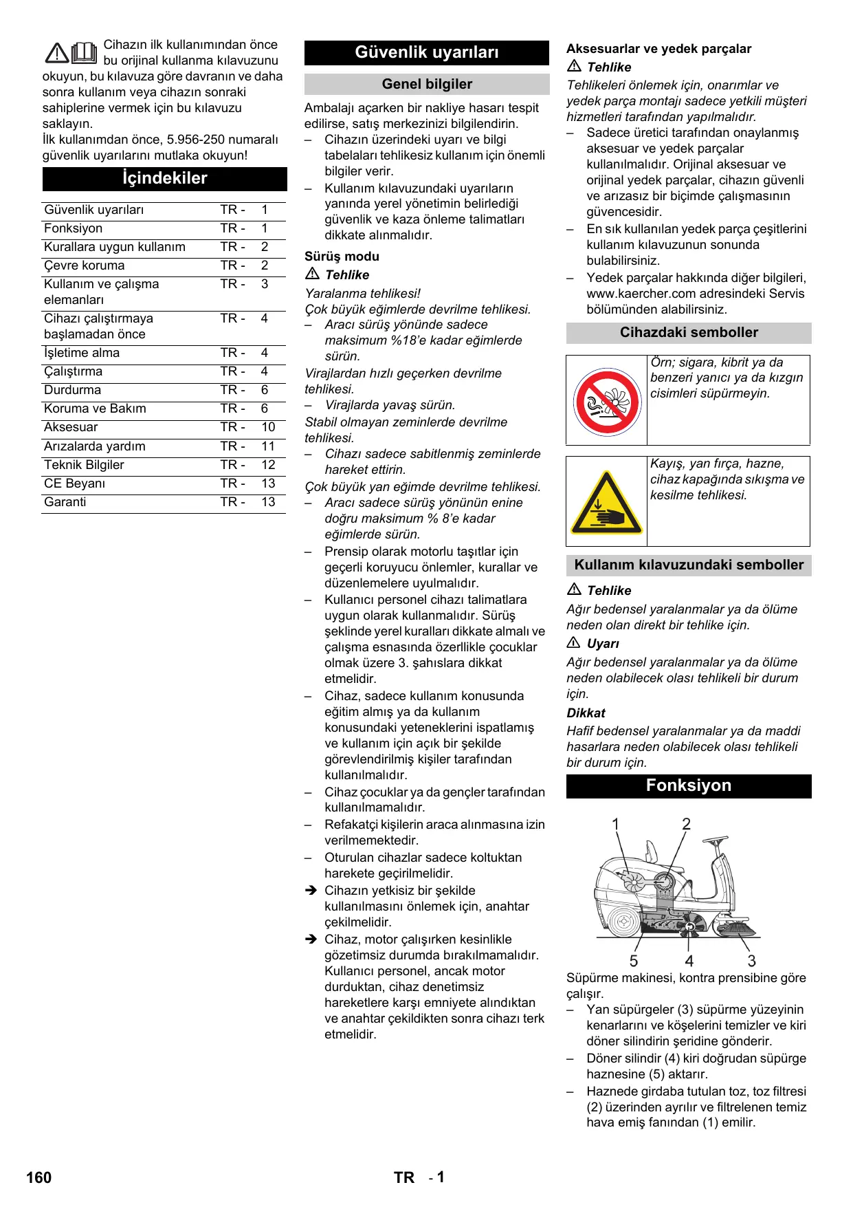 Güvenlik uyarıları Genel bilgiler Ambalajı açarken bir nakliye hasarı tespit edilirse, satış merkezinizi bilgilendirin. – Cihazın üzerindeki uyarı ve bilgi tabelaları tehlikesiz kullanım için önemli bilgiler verir. – Kullanım kılavuzundaki uyarıların yanında yerel yönetimin belirlediği güvenlik ve kaza önleme talimatları dikkate alınmalıdır. Sürüş modu Tehlike Yaralanma tehlikesi! Çok büyük eğimlerde devrilme tehlikesi. – Aracı sürüş yönünde sadece maksimum %18’e kadar eğimlerde sürün. Virajlardan hızlı geçerken devrilme tehlikesi. – Virajlarda yavaş sürün. Stabil olmayan zeminlerde devrilme tehlikesi. – Cihazı sadece sabitlenmiş zeminlerde hareket ettirin. Çok büyük yan eğimde devrilme tehlikesi. – Aracı sadece sürüş yönünün enine doğru maksimum % 8’e kadar eğimlerde sürün. – Prensip olarak motorlu taşıtlar için geçerli koruyucu önlemler, kurallar ve düzenlemelere uyulmalıdır. – Kullanıcı personel cihazı talimatlara uygun olarak kullanmalıdır. Sürüş şeklinde yerel kuralları dikkate almalı ve çalışma esnasında özerllikle çocuklar olmak üzere 3. şahıslara dikkat etmelidir. – Cihaz, sadece kullanım konusunda eğitim almış ya da kullanım konusundaki yeteneklerini ispatlamış ve kullanım için açık bir şekilde görevlendirilmiş kişiler tarafından kullanılmalıdır. – Cihaz çocuklar ya da gençler tarafından kullanılmamalıdır. – Refakatçi kişilerin araca alınmasına izin verilmemektedir. – Oturulan cihazlar sadece koltuktan harekete geçirilmelidir. Î Cihazın yetkisiz bir şekilde kullanılmasını önlemek için, anahtar çekilmelidir. Î Cihaz, motor çalışırken kesinlikle gözetimsiz durumda bırakılmamalıdır. Kullanıcı personel, ancak motor durduktan, cihaz denetimsiz hareketlere karşı emniyete alındıktan ve anahtar çekildikten sonra cihazı terk etmelidir. TR - 1 Aksesuarlar ve yedek parçalar Tehlike Tehlikeleri önlemek için, onarımlar ve yedek parça montajı sadece yetkili müşteri hizmetleri tarafından yapılmalıdır. – Sadece üretici tarafından onaylanmış aksesuar ve yedek parçalar kullanılmalıdır. Orijinal aksesuar ve orijinal yedek parçalar, cihazın güvenli ve arızasız bir biçimde çalışmasının güvencesidir. – En sık kullanılan yedek parça çeşitlerini kullanım kılavuzunun sonunda bulabilirsiniz. – Yedek parçalar hakkında diğer bilgileri, www.kaercher.com adresindeki Servis bölümünden alabilirsiniz. Cihazdaki semboller Örn; sigara, kibrit ya da benzeri yanıcı ya da kızgın cisimleri süpürmeyin. Kayış, yan fırça, hazne, cihaz kapağında sıkışma ve kesilme tehlikesi. Kullanım kılavuzundaki semboller Tehlike Ağır bedensel yaralanmalar ya da ölüme neden olan direkt bir tehlike için. 몇 Uyarı Ağır bedensel yaralanmalar ya da ölüme neden olabilecek olası tehlikeli bir durum için. Dikkat Hafif bedensel yaralanmalar ya da maddi hasarlara neden olabilecek olası tehlikeli bir durum için. Fonksiyon Süpürme makinesi, kontra prensibine göre çalışır. – Yan süpürgeler (3) süpürme yüzeyinin kenarlarını ve köşelerini temizler ve kiri döner silindirin şeridine gönderir. – Döner silindir (4) kiri doğrudan süpürge haznesine (5) aktarır. – Haznede girdaba tutulan toz, toz filtresi (2) üzerinden ayrılır ve filtrelenen temiz hava emiş fanından (1) emilir. Kurallara uygun kullanım Bu süpürme makinesini sadece bu kullanım kılavuzundaki bilgilere uygun olarak kullanın. Î Cihaz, çalışma düzenekleriyle birlikte kullanılmadan önce düzgün durum ve çalışma güvenliği kontrollerinden geçirilmelidir. Eğer hasar veya eksik var ise kullanılmamalıdır. – Bu süpürme makinesi, iç ve dış alanlarda kirlenmiş yüzeyleri temizlemek için üretilmiştir. – Cihaz, açık trafikte kullanım için uygun değildir. – Cihaz, zararlı tozların emilmesi için uygun değildir. – Cihaz üzerinde değişiklikler yapılmamalıdır. – Asla patlayıcı sıvılar, yanıcı gazlar ve de inceltilmiş asit ve çözücü süpürmeyiniz/madde temizlemeyiniz! Buna, emilen havayal girdaba tutulduğu zaman patlayıcı buharlar oluşturabilen benzin, tiner veya motorin de dahil edilir, ayrıca aseton, inceltilmiş asit ve çözücü madde de sayılabilir, çünkü bunlar cihazda kullanılmakta olan malzemelere bulaşabilir. – Yanan veya kor halindeki maddeleri süpürmeyiniz/temizlemeyiniz. – Cihaz, sadece kullanım kılavuzunda açıklanan zeminler için uygundur. – Sadece işletmeci veya yetkilisi tarafından, makine kullanımı için onaylanmış yüzeyler temizlenmelidir. – Tehlike bölgesinde bulunmak yasaktır. Patlama tehlikesi olan odalarda cihazın çalıştırılması yasaktır. – Genel olarak şu geçerlidir: Kolay tutuşabilen maddeleri cihazdan uzak tutun (Patlama/yanma tehlikesi). Çevre koruma Ambalaj malzemeleri geri dönüştürülebilir. Ambalaj malzemelerini evinizin çöpüne atmak yerine lütfen tekrar kullanılabilecekleri yerlere gönderin. Eski cihazlarda, yeniden değerlendirme işlemine tabi tutulması gereken değerli geri dönüşüm malzemeleri bulunmaktadır. Aküler, yağ ve benzeri maddeler doğaya ulaşmamalıdır. Bu nedenle eski cihazları lütfen öngörülen toplama sistemleri aracılığıyla imha edin. İçindekiler hakkında uyarılar (REACH) İçindekiler hakkında ayrıntılı bilgileri bulabileceğiniz adres: http://www.karcher.de/de/unternehmen/ umweltschutz/REACH.htm Uygun zeminler