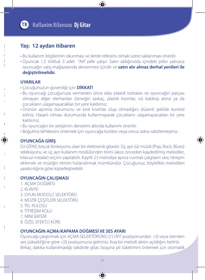 ) si o di na- • Le jouet fonctionne avec 3 piles “AA” de 1,5 Volt incluses. Les piles incluses avec le produit au moment de l’achat ne servent que pour la démonstration sur le point de vente et doivent être remplacées immédiatement par des piles neuves après l’achat. AVERTISSEMENTS Pour la sécurité de votre enfant: ATTENTION! • Avant l’utilisation enlever et éliminer les sachets en plastique et autres éléments éventuels qui ne font pas partie du jouet (par exemple, liens, éléments de fixation, etc.) et les placer hors de portée des enfants. • Vérifier régulièrement l’état d’usure du produit et la présence d’éventuelles détériorations. En cas de dommages, ne pas se servir du jeu et le tenir hors de portée des enfants. • Produit non adapté aux enfants de mois de 36 mois en raison de ses caractéristiques de constructions, de ses fonctions et de la présence de petites pièces. • Pour l’utilisation de ce jouet, nous recommandons la surveillance d’un adulte. • Ne pas attacher de lacets ou de cordons à la guitare pour éviter tout risque d’étranglement. INTRODUCTION AU JEU DJ Mix Guitare est une guitare électronique riche en activités et fonctions. L’enfant peut sélectionner son style musical préféré (Pop, Rock, Blues) et choisir parmi trois modes d’utilisation (accords, mélodies pré-enregistrées, notes-guides). Sur la base des 23 mélodies pré-enregistrées, il peut rajouter le son des percussions, du vibrato et accélérer le rythme de la musique. Tout en développant sa créativité, l’enfant personnalise les mélodies. FONCTIONNEMENT DU JOUET 1. SELECTEUR D’ALLUMAGE 2. CLAVIER 3. SÉLECTEUR MODES DE JEU 4. SÉLECTEUR GENRES MUSICAUX Pour éviter une consommation inutile des piles, nous conseillons de toujours éteindre le jouet après l’utilisation en tournant le SELECTEUR D’ALLUMAGE (1) sur la position OFF.