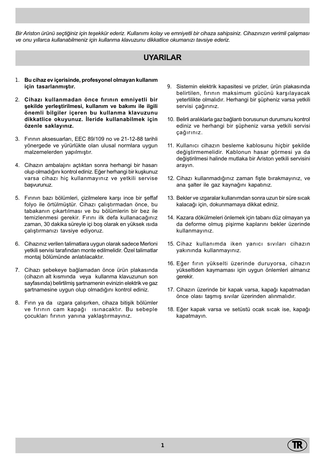 Bir Ariston ürünü seçtiðiniz için teþekkür ederiz. Kullanýmý kolay ve emniyetli bir cihaza sahipsiniz. Cihazýnýzýn verimli çalýþmasý ve onu yýllarca kullanabilmeniz için kullanma klavuzunu dikkatlice okumanýzý tavsiye ederiz.