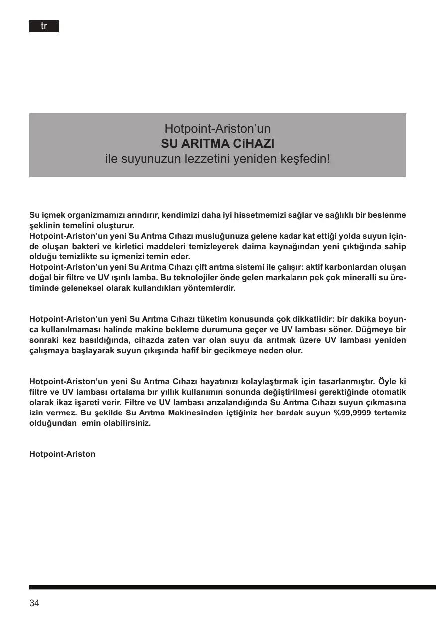 Hotpoint-Ariston’un SU ARITMA CiHAZI ile suyunuzun lezzetini yeniden keşfedin! Su içmek organizmamızı arındırır, kendimizi daha iyi hissetmemizi sağlar ve sağlıklı bir beslenme şeklinin temelini oluşturur. Hotpoint-Ariston’un yeni Su Arıtma Cıhazı musluğunuza gelene kadar kat ettiği yolda suyun içinde oluşan bakteri ve kirletici maddeleri temizleyerek daima kaynağından yeni çıktığında sahip olduğu temizlikte su içmenizi temin eder. Hotpoint-Ariston’un yeni Su Arıtma Cıhazı çift arıtma sistemi ile çalışır: aktif karbonlardan oluşan doğal bir filtre ve UV ışınlı lamba. Bu teknolojiler önde gelen markaların pek çok mineralli su üretiminde geleneksel olarak kullandıkları yöntemlerdir. Hotpoint-Ariston’un yeni Su Arıtma Cıhazı tüketim konusunda çok dikkatlidir: bir dakika boyunca kullanılmaması halinde makine bekleme durumuna geçer ve UV lambası söner. Düğmeye bir sonraki kez basıldığında, cihazda zaten var olan suyu da arıtmak üzere UV lambası yeniden çalışmaya başlayarak suyun çıkışında hafif bir gecikmeye neden olur. Hotpoint-Ariston’un yeni Su Arıtma Cıhazı hayatınızı kolaylaştırmak için tasarlanmıştır. Öyle ki filtre ve UV lambası ortalama bır yıllık kullanımın sonunda değiştirilmesi gerektiğinde otomatik olarak ikaz işareti verir. Filtre ve UV lambası arızalandığında Su Arıtma Cıhazı suyun çıkmasına izin vermez. Bu şekilde Su Arıtma Makinesinden içtiğiniz her bardak suyun %99,9999 tertemiz olduğundan emin olabilirsiniz. Hotpoint-Ariston