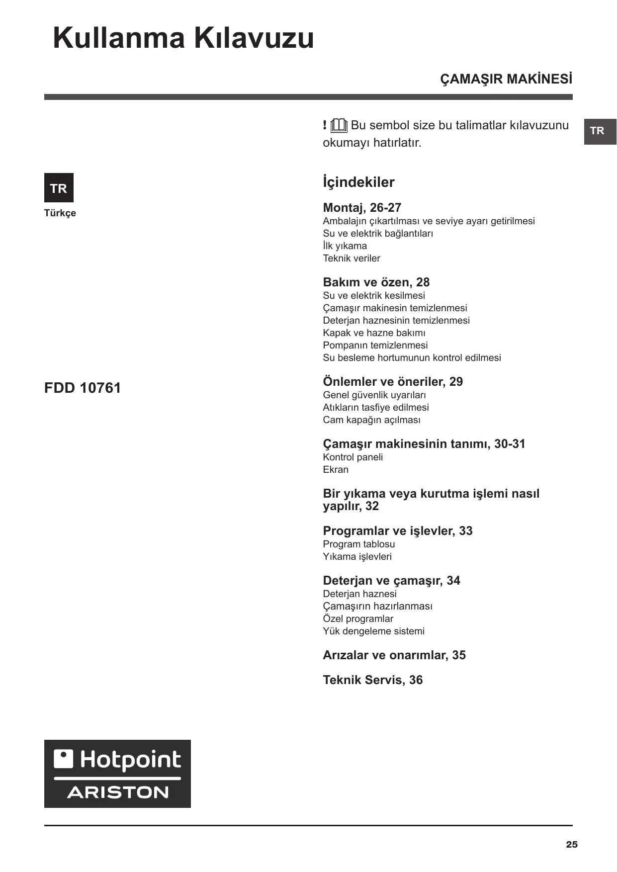 Bu sembol size bu talimatlar kılavuzunu okumayı hatırlatır. Türkçe İçindekiler Montaj, 26-27 Ambalajın çıkartılması ve seviye ayarı getirilmesi Su ve elektrik bağlantıları İlk yıkama Teknik veriler Bakım ve özen, 28 Su ve elektrik kesilmesi Çamaşır makinesin temizlenmesi Deterjan haznesinin temizlenmesi Kapak ve hazne bakımı Pompanın temizlenmesi Su besleme hortumunun kontrol edilmesi FDD 10761 Önlemler ve öneriler, 29 Genel güvenlik uyarıları Atıkların tasfiye edilmesi Cam kapağın açılması Çamaşır makinesinin tanımı, 30-31 Kontrol paneli Ekran Bir yıkama veya kurutma işlemi nasıl yapılır, 32 Programlar ve işlevler, 33 Program tablosu Yıkama işlevleri Deterjan ve çamaşır, 34 Deterjan haznesi Çamaşırın hazırlanması Özel programlar Yük dengeleme sistemi Arızalar ve onarımlar, 35 Teknik Servis, 36