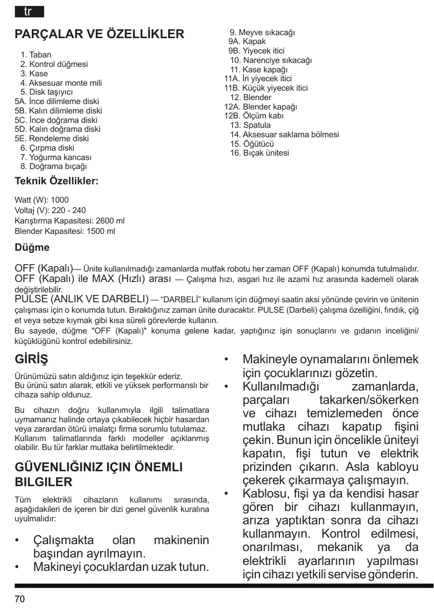 Yiyecek alma oluguna asla elinizle gida yerlestirmeyin. Her zaman yiyecek iticiyi kullanin. - Patlayici ve/veya yanici duman ihtiva eden ortamlarda bu cihazi kullanmayin.