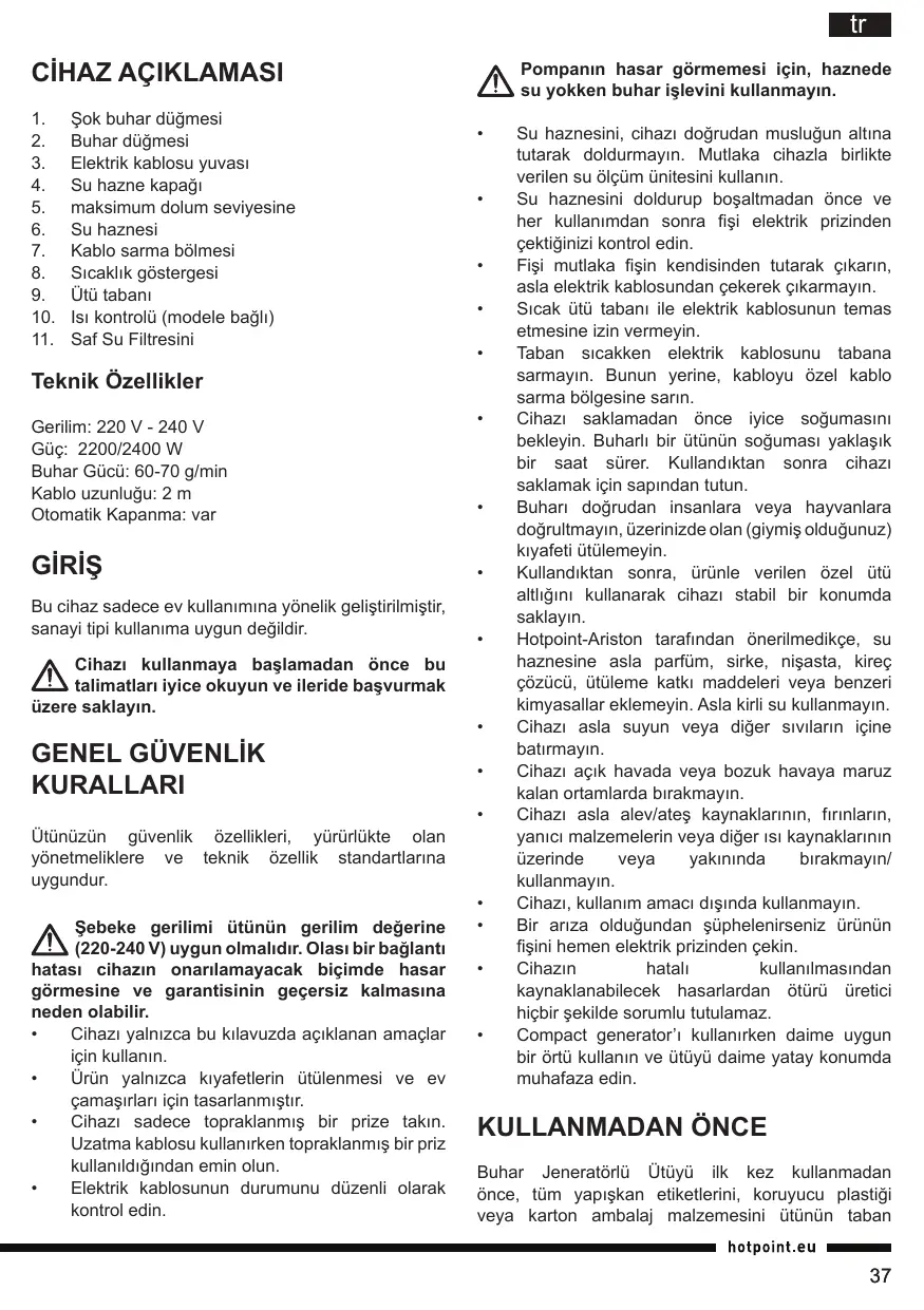 - Fiş, elektrik kablosu ya da cihaz hasarl gürününya veya su sizintisi tespit etiyseniz ütuyu kullanmayın. Bu gibi durumlarda, olası tehlilelerin önlomensi,—çın ürünü Hotpoint-Ariston yetkili servis merkezine kontrl attirin.