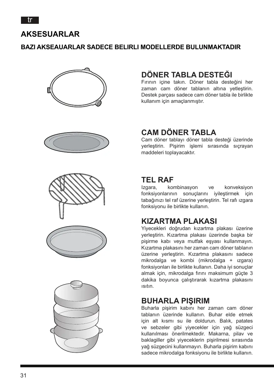 Aksesuarlar Bazı akseauarlar sadece belirli modellerde bulunmaktadır Döner tabla desteği Fırının içine takın. Döner tabla desteğini her zaman cam döner tablanın altına yetleştirin. Destek parçası sadece cam döner tabla ile birlikte kullanım için amaçlanmıştır. Cam döner tabla Cam döner tablayı döner tabla desteği üzerinde yerleştirin. Pişirim işlemi sırasında sıçrayan maddeleri toplayacaktır. Tel raf Izgara, kombinasyon konveksiyon fonksiyonlarının sonuçlarını iyileştirmek için tabağınızı tel raf üzerine yerleştirin. Tel rafı ızgara fonksiyonu ile birlikte kullanın. Kızartma plakası Yiyecekleri doğrudan kızartma plakası üzerine yerleştirin. Kızartma plakası üzerinde başka bir pişirme kabı veya mutfak eşyası kullanmayın. Kızartma plakasını her zaman cam döner tablanın üzerine yerleştirin. Kızartma plakasını sadece mikrodalga ve kombi (mikrodalga + ızgara) fonksiyonları ile birlikte kullanın. Daha iyi sonuçlar almak için, mikrodalga fırını maksimum güçte 3 dakika boyunca çalıştırarak kızartma plakasını ısıtın. Buharla Pişirim Buharla pişirim kabını her zaman cam döner tablanın üzerinde kullanın. Buhar elde etmek için alt kısmı su ile doldurun. Balık, patates ve sebzeler gibi yiyecekler için yağ süzgeci kullanılması önerilmektedir. Makarna, pilav ve baklagiller gibi yiyeceklerin pişirilmesi sırasında yağ süzgecini kullanmayın. Buharla pişirim kabını sadece mikrodalga fonksiyonu ile birlikte kullanın.