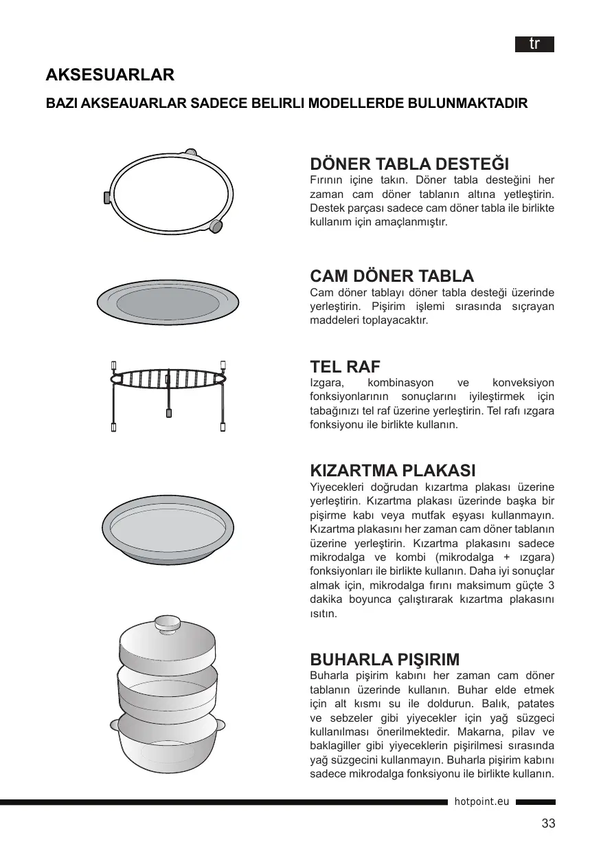 Buharla pişirim kabını her zaman cam döner tablanın üzerinde kullanın. Buhar elde etmek için alt kısmı su ile doldurun. Balık, patates ve sebzeler gibi yiyecekler için yağ süzgeci kullanılması önerilmektedir. Makarna, pilav ve baklagiller gibi yiyeceklerin pişirilmesi sırasında yağ süzgecini kullanmayın. Buharla pişirim kabını sadece mikrodalga fonksiyonu ile birlikte kullanın. hotpoint.eu