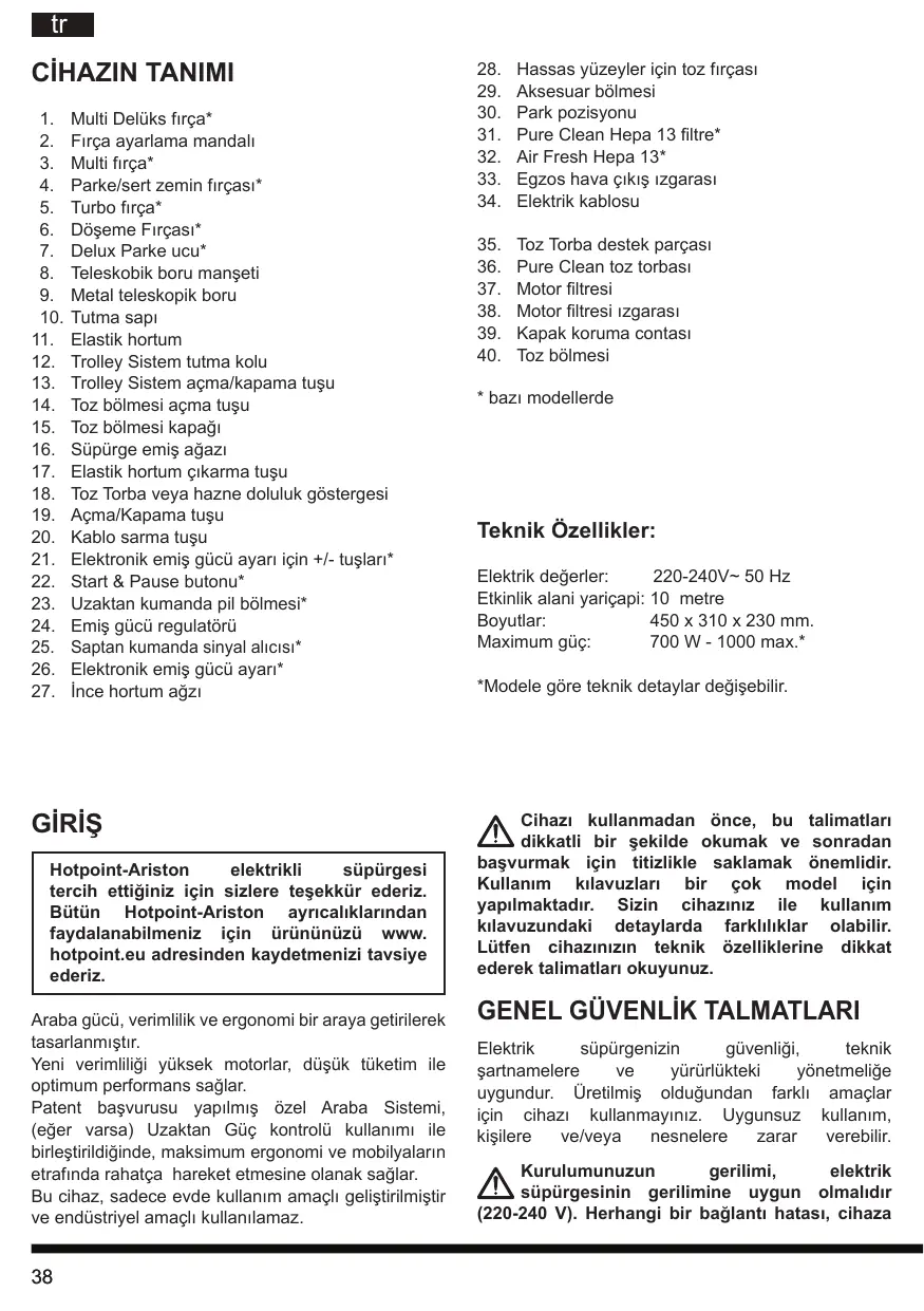 Multi Delüks fırça* Fırça ayarlama mandalı Multi fırça* Parke/sert zemin fırçası* Turbo fırça* Döşeme Fırçası* Delux Parke ucu* Teleskobik boru manşeti Metal teleskopik boru Tutma sapı Elastik hortum Trolley Sistem tutma kolu Trolley Sistem açma/kapama tuşu Toz bölmesi açma tuşu Toz bölmesi kapağı Süpürge emiş ağazı Elastik hortum çıkarma tuşu Toz Torba veya hazne doluluk göstergesi Açma/Kapama tuşu Kablo sarma tuşu Elektronik emiş gücü ayarı için +/- tuşları* Start & Pause butonu* Uzaktan kumanda pil bölmesi* Emiş gücü regulatörü Saptan kumanda sinyal alıcısı* Elektronik emiş gücü ayarı* İnce hortum ağzı GİRİŞ Hotpoint-Ariston elektrikli süpürgesi tercih ettiğiniz için sizlere teşekkür ederiz. Bütün Hotpoint-Ariston ayrıcalıklarından faydalanabilmeniz için ürününüzü www. hotpoint.eu adresinden kaydetmenizi tavsiye ederiz. Araba gücü, verimlilik ve ergonomi bir araya getirilerek tasarlanmıştır. Yeni verimliliği yüksek motorlar, düşük tüketim ile optimum performans sağlar. Patent başvurusu yapılmış özel Araba Sistemi, (eğer varsa) Uzaktan Güç kontrolü kullanımı ile birleştirildiğinde, maksimum ergonomi ve mobilyaların etrafında rahatça hareket etmesine olanak sağlar. Bu cihaz, sadece evde kullanım amaçlı geliştirilmiştir ve endüstriyel amaçlı kullanılamaz.