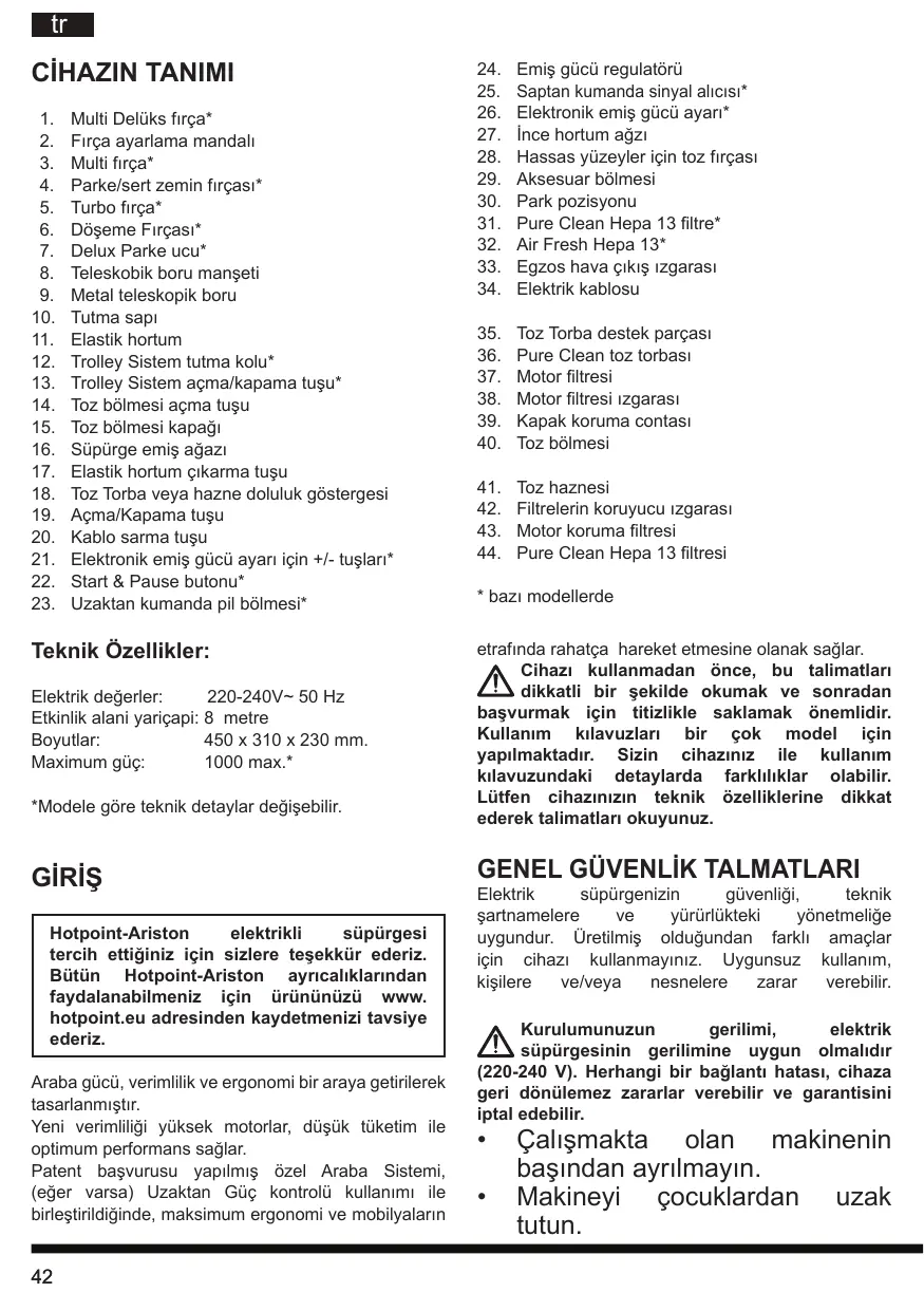 Multi Delüks fırça* Fırça ayarlama mandalı Multi fırça* Parke/sert zemin fırçası* Turbo fırça* Döşeme Fırçası* Delux Parke ucu* Teleskobik boru manşeti Metal teleskopik boru Tutma sapı Elastik hortum Trolley Sistem tutma kolu* Trolley Sistem açma/kapama tuşu* Toz bölmesi açma tuşu Toz bölmesi kapağı Süpürge emiş ağazı Elastik hortum çıkarma tuşu Toz Torba veya hazne doluluk göstergesi Açma/Kapama tuşu Kablo sarma tuşu Elektronik emiş gücü ayarı için +/- tuşları* Start & Pause butonu* Uzaktan kumanda pil bölmesi* Teknik Özellikler: Elektrik değerler: 220-240V~ 50 Hz Etkinlik alani yariçapi: 8 metre Boyutlar: 450 x 310 x 230 mm. Maximum güç: 1000 max.* *Modele göre teknik detaylar değişebilir. GİRİŞ Hotpoint-Ariston elektrikli süpürgesi tercih ettiğiniz için sizlere teşekkür ederiz. Bütün Hotpoint-Ariston ayrıcalıklarından faydalanabilmeniz için ürününüzü www. hotpoint.eu adresinden kaydetmenizi tavsiye ederiz. Araba gücü, verimlilik ve ergonomi bir araya getirilerek tasarlanmıştır. Yeni verimliliği yüksek motorlar, düşük tüketim ile optimum performans sağlar. Patent başvurusu yapılmış özel Araba Sistemi, (eğer varsa) Uzaktan Güç kontrolü kullanımı ile birleştirildiğinde, maksimum ergonomi ve mobilyaların