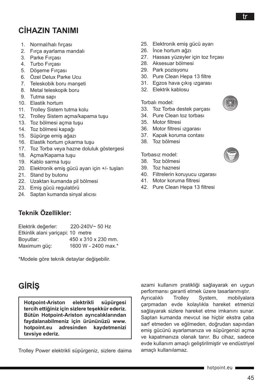 Teknik Özellikler: Elektrik değerler: 220-240V~ 50 Hz Etkinlik alani yariçapi: 10 metre Boyutlar: 450 x 310 x 230 mm. Maximum güç: 1600 W - 2400 max.* *Modele göre teknik detaylar değişebilir. GİRİŞ Hotpoint-Ariston elektrikli süpürgesi tercih ettiğiniz için sizlere teşekkür ederiz. Bütün Hotpoint-Ariston ayrıcalıklarından faydalanabilmeniz için ürününüzü www. hotpoint.eu adresinden kaydetmenizi tavsiye ederiz. Trolley Power elektrikli süpürgeniz, sizlere daima azami kullanım pratikliği sağlayarak en uygun performansı garanti etmek üzere tasarlanmıştır. Ayrıcalıklı Trolley System, mobilyalara çarpmadan evde kolaylıkla hareket etmenizi sağlayarak sizlere hareket etme imkanını sunar. Saptan kumanda mevcut ise hiçbir ekstra çaba sarf etmeden ve eğilmeden, doğrudan sapından emiş gücünü ayarlamanıza ve süpürgenizi açma ve kapatmanıza olanak tanır. Bu cihaz, sadece evde kullanım amaçlı geliştirilmiştir ve endüstriyel amaçlı kullanılamaz. hotpoint.eu