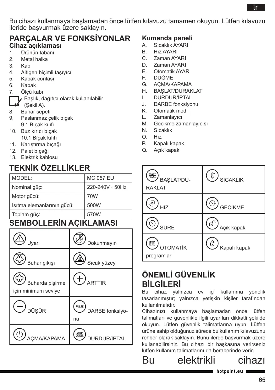 Retrouvez gratuitement la notice de l'appareil MC 057C AX0 HOTPOINT au format PDF.