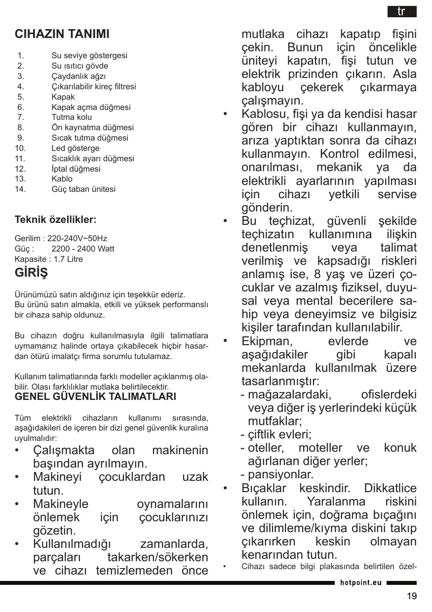 Gerilim : 220-240V~50Hz Güç : 2200 - 2400 Watt Kapasite : 1.7 Litre GİRİŞ Ürünümüzü satın aldığınız için teşekkür ederiz. Bu ürünü satın almakla, etkili ve yüksek performanslı bir cihaza sahip oldunuz. Bu cihazın doğru kullanılmasıyla ilgili talimatlara uymamanız halinde ortaya çıkabilecek hiçbir hasardan ötürü imalatçı firma sorumlu tutulamaz.