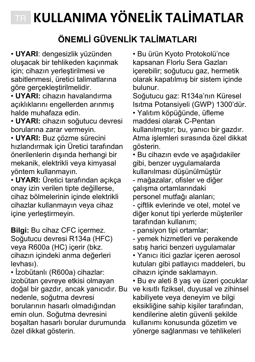 + UYARI: dengesizlik yüzünden olusacak bir tehlikeden kaçinmak için; cihazin yerlestirilmesi ve sabitlenmesi, üretici talimatlarina gôüre gerçeklestirilmelidir. - UYARI!: cihazin havalandirma agçikliklarin: engellerden arinmis halde muhafaza edin. + UYARI: cihazin soÿutucu devresi borularina zarar vermeyin. + UYARI: Buz çôzme sürecini hizlandirmak için Üretici tarafindan ônerilenlerin disinda herhangi bir mekanik, elektrikli veya kimyasal yôntem kullanmayin. + UYARI: Üretici tarafindan açikça onay izin verilen tipte degillerse, cihaz bôlmelerinin içinde elektrikli cihazlar kullanmayin veya cihaz içine yerlestirmeyin. Bilgi: Bu cihaz CFC içermez. Soÿutucu devresi R134a (HFC) veya R600a (HC) içerir (bkz. cihazin içindeki anma degÿerleri levhasi). + izobütanli (R600a) cihazlar: izobütan çevreye etkisi omayan doÿal bir gazdir, ancak yanicidir. Bu nedenle, soÿutma devresi borularinin hasarli olmadiÿindan emin olun. Soÿutma devresini bosaltan hasarli borular durumunda ôzel dikkat gôsterin. -* Bu ürün Kyoto Protokolü’nce kapsanan Florlu Sera Gazlari içerebilir, soÿutucu gaz, hermetik olarak kapatilmis bir sistem içinde bulunur. Soÿutucu gaz: R134a’nin Küresel Isitma Potansiyeli (GWP) 1300’dür. + Yalitim kôpügünde, üfleme maddesi olarak C-Pentan kullaniimistir; bu, yanici bir gazdir. Atma islemleri sirasinda ôzel dikkat gôsterin. - Bu cihazin evde ve asaÿidakiler gibi, benzer uygulamalarda kullaniimasi düsünülmüstür - maÿazalar, ofisler ve diger çalisma ortamlarindaki personel mutfaÿi alanlari; - Giftlik evlerinde ve otel, motel ve diÿer konut tipi yerlerde müsteriler tarafindan kullanim; - pansiyon tipi ortamlar; - yemek hizmetleri ve perakende satis harici benzeri uygulamalar
