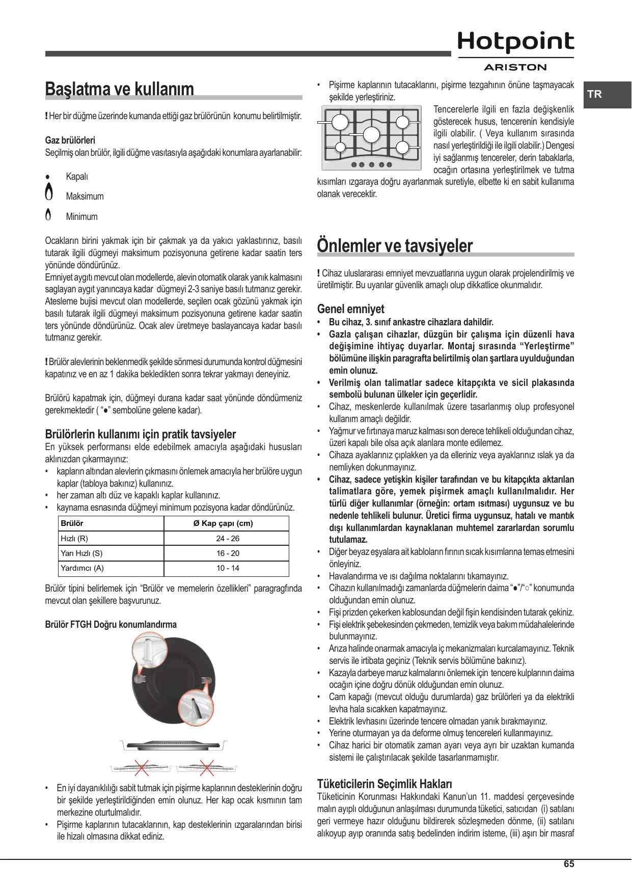 • D’utiliser des récipients appropriés à chaque brûleur (voir tableau) pour éviter que les flammes ne dépassent de sous les casseroles. • De toujours utiliser des casseroles à fond plat et avec couvercle. • De tourner la manette dans la position minimum au moment de l’ébullition. Brûleurs