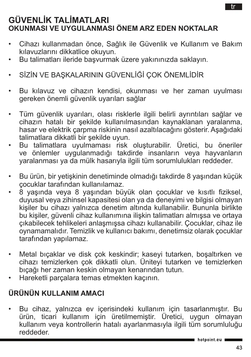 Bu ürün, bir yetişkinin denetiminde olmadığı takdirde 8 yaşından küçük çocuklar tarafından kullanılamaz. 8 yaşında veya 8 yaşından büyük olan çocuklar ve kısıtlı fiziksel, duyusal veya zihinsel kapasitesi olan ya da deneyimi ve bilgisi olmayan kişiler bu cihazı yalnızca denetim altında kullanabilir. Bununla birlikte bu kişiler, güvenli cihaz kullanımına ilişkin talimatları almışsa ve ortaya çıkabilecek tehlikeleri anlaşmışsa cihazı kullanabilir. Çocuklar, cihaz ile oynamamalıdır. Temizlik ve kullanıcı bakımı, denetimsiz olarak çocuklar tarafından yapılamaz. Metal bıçaklar ve disk çok keskindir; kaseyi tutarken, boşaltırken ve cihazı temizlerken çok dikkatli olun. Üniteyi tutarken ve temizlerken bıçağı her zaman keskin olmayan kenarından tutun. Hareketli parçalara temas etmekten kaçının.