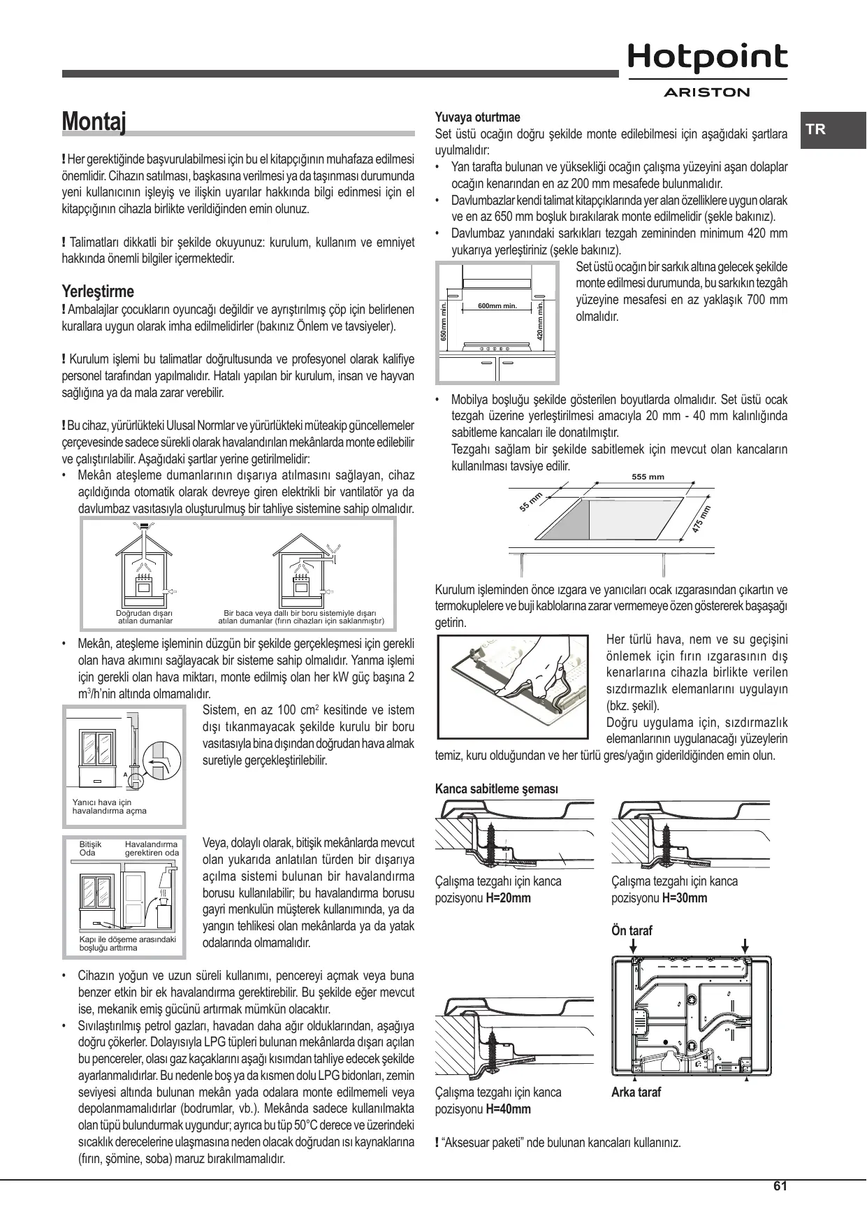 ! Bu cihaz, yürürlükteki Ulusal Normlar ve yürürlükteki müteakip güncellemeler çerçevesinde sadece sürekli olarak havalandırılan mekânlarda monte edilebilir ve çalıştırılabilir. Aşağıdaki şartlar yerine getirilmelidir: • Mekân ateşleme dumanlarının dışarıya atılmasını sağlayan, cihaz açıldığında otomatik olarak devreye giren elektrikli bir vantilatör ya da davlumbaz vasıtasıyla oluşturulmuş bir tahliye sistemine sahip olmalıdır.