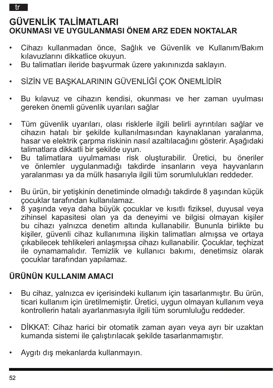 Cet appareil est conçu uniquement pour un usage domestique. Il n’est pas prévu pour un usage commercial. Le fabricant décline toute responsabilité en cas d’utilisation inappropriée ou de mauvais réglage des commandes.