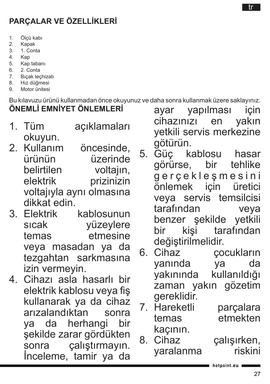 12.Ne laissez jamais l’appareil sans surveillance. 13.Lorsque vous retirez le mixeur du moteur, attendez que les lames cessent complètement de tourner. 14.Mettez toujours le mixeur en marche avec le couvercle bien fermé. 15.Utilisez toujours l’appareil sur une surface sécurisée, sèche et plane. 16.Ne placez jamais l’appareil sur ou près d’une plaque à gaz ou électrique chaude, où il serait en contact avec des appareils chauds. 17.Ne pas l’utiliser à l’extérieur. 18.Ne pas utiliser l’appareil pour un usage autre que celui prévu. 19.Faire attention aux