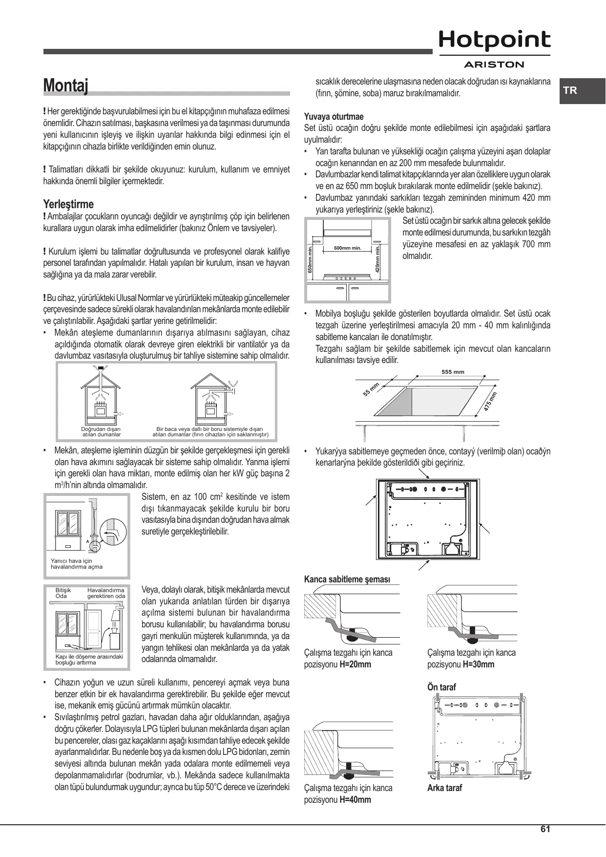 • Si la table n’est pas installée au-dessus d’un four à encastrer, il faut monter un panneau d’isolation en bois. Il faut le monter à au moins 20 mm de distance du bord inférieur de la table. Aération Pour garantir une bonne aération, la cavité d’encastrement doit être dépourvue de paroi arrière. Il est conseillé d’installer le four de manière à ce qu’il repose sur deux cales en bois ou bien sur un plan d’appui continu qui ait une découpe d’au moins 45 x 560 mm (voir figures).