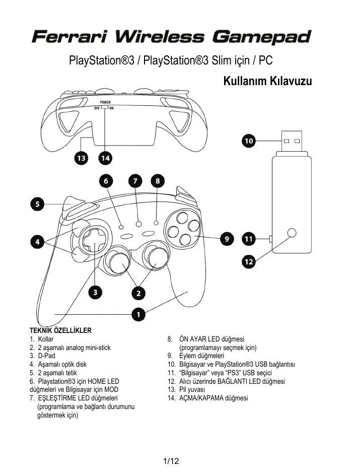 GENEL BAKIŞ AÇMA/KAPAMA düğmesi (14) - KAPALI konum = oyun kumandası kapalıdır (ve pil kullanmaz). - AÇIK konum = oyun kumandası açıktır. “Bilgisayar / PS3” USB seçici (11) Alıcınızın USB bağlantısını takmadan önce mutlaka doğru konuma ayarlanmalıdır. EŞLEME (7) ve BAĞLANTI (12) mavi LEDleri - Her iki LED yanıyor = oyun kumandası ve alıcı arasında bağlantı kurulmuş. - Her iki LED hızla yanıp sönüyor = oyun kumandası ve alıcı arasında bağlantı yok. - EŞLEME LEDİ kapalı = oyun kumandası bekleme modunda veya kapalı. - EŞLEME LEDİ yavaş ve sürekli olarak yanıyor = lütfen pilleri değiştirin. OYUN KUMANDASI VE ALICI ARASINDA OTOMATİK OLARAK BAĞLANTI KURULMUŞ Hata olması durumunda bağlantıyı kurmak: Alıcı üzerindeki BAĞLAN düğmesine basın ve aynı anda oyun kumandanızdaki L2 + R2 + EŞLEME düğmelerine basın.