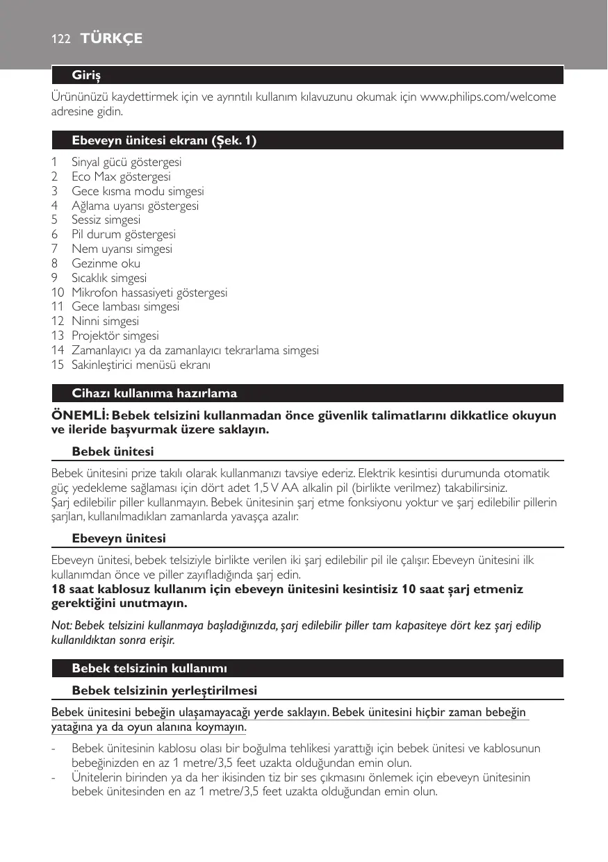 Sinyal gücü göstergesi Eco Max göstergesi Gece kısma modu simgesi Ağlama uyarısı göstergesi Sessiz simgesi Pil durum göstergesi Nem uyarısı simgesi Gezinme oku Sıcaklık simgesi Mikrofon hassasiyeti göstergesi Gece lambası simgesi Ninni simgesi Projektör simgesi Zamanlayıcı ya da zamanlayıcı tekrarlama simgesi Sakinleştirici menüsü ekranı Cihazı kullanıma hazırlama ÖNEMLİ: Bebek telsizini kullanmadan önce güvenlik talimatlarını dikkatlice okuyun ve ileride başvurmak üzere saklayın. Bebek ünitesi Bebek ünitesini prize takılı olarak kullanmanızı tavsiye ederiz. Elektrik kesintisi durumunda otomatik güç yedekleme sağlaması için dört adet 1,5 V AA alkalin pil (birlikte verilmez) takabilirsiniz. Şarj edilebilir piller kullanmayın. Bebek ünitesinin şarj etme fonksiyonu yoktur ve şarj edilebilir pillerin şarjları, kullanılmadıkları zamanlarda yavaşça azalır. Ebeveyn ünitesi Ebeveyn ünitesi, bebek telsiziyle birlikte verilen iki şarj edilebilir pil ile çalışır. Ebeveyn ünitesini ilk kullanımdan önce ve piller zayıfladığında şarj edin. 18 saat kablosuz kullanım için ebeveyn ünitesini kesintisiz 10 saat şarj etmeniz gerektiğini unutmayın. Not: Bebek telsizini kullanmaya başladığınızda, şarj edilebilir piller tam kapasiteye dört kez şarj edilip kullanıldıktan sonra erişir. Bebek telsizinin kullanımı Bebek telsizinin yerleştirilmesi Bebek ünitesini bebeğin ulaşamayacağı yerde saklayın. Bebek ünitesini hiçbir zaman bebeğin yatağına ya da oyun alanına koymayın. -- Bebek ünitesinin kablosu olası bir boğulma tehlikesi yarattığı için bebek ünitesi ve kablosunun bebeğinizden en az 1 metre/3,5 feet uzakta olduğundan emin olun. -- Ünitelerin birinden ya da her ikisinden tiz bir ses çıkmasını önlemek için ebeveyn ünitesinin bebek ünitesinden en az 1 metre/3,5 feet uzakta olduğundan emin olun. Türkçe 123 Ebeveyn ünitesi ve bebek ünitesinin birbirine bağlanması 1 Güç açma ışığı yanana kadar bebek ünitesindeki 3 düğmesini 2 saniye basılı tutun. 2 Ekran ışığı yanana kadar ebeveyn ünitesindeki 3 düğmesini 2 saniye basılı tutun. Ebeveyn ünitesindeki ‘link’ (bağlantı) ışığı kırmızı renkte yanıp sönmeye başlar ve ekranda ‘I AM LINKING’ (BAĞLANIYORUM) mesajı belirir. ,, Ebeveyn ünitesiyle bebek ünitesi birbirlerine bağlıyken, ‘link’ (bağlantı) ışığı sabit yeşil renkte yanmaya başlar. Ekranda sinyal gücü göstergesi ve ‘LINKED’ (BAĞLI) mesajı görüntülenir. ,, Bağlantı kurulamazsa NOT LINKED (BAĞLI DEĞİL) mesajı görüntülenir ve ebeveyn ünitesi bip sesi çıkarmaya başlar. Bağlantı kurulamadığında yapılması gerekenler -- Menzil dışındaysa, ebeveyn ünitesini bebek ünitesinin yakınına yerleştirin. Ancak bebek ünitesinden en az 1 metre/3,5 feet uzakta olduğundan emin olun. -- Bebek veya ebeveyn ünitesi başka bir DECT cihazına (örn. kablosuz bir telefon) çok yakınsa bu cihazı kapatın veya üniteyi bu cihazdan uzaklaştırın. -- Bebek ünitesi kapalı ise üniteyi açın. Çalışma menzili -- Çalışma menzili dış mekanda 330 metre/1000 feet, iç mekanlarda ise ve 50 metre/150 feet’tir. -- Bebek telsizinin çalışma menzili çevresel koşullara ve parazit yaratabilecek etkenlere bağlı olarak değişir. Islak ve nemli malzemelerin neden olduğu parazit menzil kaybının %100’e ulaşmasına neden olabilir. Kuru malzemelerden kaynaklanan parazitler için aşağıdaki tabloya bakın Kuru malzemeler Malzeme kalınlığı Menzil kaybı Ahşap, sıva, karton, cam (metal, tel ya da kurşun içermeyen) < 30 cm (12 inç) %0 - %10 Tuğla, kontrplak < 30 cm (12 inç) %5 - %35 Güçlendirilmiş beton < 30 cm (12 inç) %30 - %100 Metal ızgaralar ya da çubuklar < 1 cm (0,4 inç) %90 - %100 Metal ya da alüminyum levhalar < 1 cm (0,4 inç) %100 Bebek ünitesi fonksiyonları ve bilgileri Gece lambası Gece lambası bebeğinizi rahatlatan hafif bir ışık sunar. 1 Gece lambasını açmak veya kapatmak için bebek ünitesindeki Q düğmesine basın. Ninni fonksiyonu 1 Son seçilen ninniyi çalmak için bebek ünitesindeki K düğmesine basın. Seçilen ninni belirlenen süre boyunca tekrarlanır. (Şek. 2) 2 Listeden bir başka ninni seçmek için ►| düğmesine basın. (Şek. 3) 3 Ninni ses seviyesini ayarlamak için bebek ünitesindeki ses + veya ses - düğmesine basın (Şek. 4). Not: Bebek ünitesindeki hoparlör ses seviyesini sadece bir ninni çalarken ayarlayabilirsiniz. Ninni için daha yüksek bir ses seviyesi ayarlarsanız, ebeveyn ünitesindeki konuşma fonksiyonunu kullanırken çıkan ses de daha yüksek olacaktır. 4 Ninni çalmayı durdurmak için bebek ünitesindeki K düğmesine basın. 124 Türkçe Projektör Bebeğinizi rahatlatmak için projektörü açıp, projektörün tavana yansıttığı renkli ışık desenlerini kullanabilirsiniz. 1 Projektörü açmak için açma/kapama düğmesine basın. Ebeveyn ünitesi ekranında projektör simgesi görüntülenir (Şek. 5). ,, Altı farklı desen mevcuttur. İlk desen 2 saniye içinde yavaşça belirir. 8 saniye boyunca yansıtılır ve ardından 2 saniye boyunca yavaşça söner. Bu sırada diğer desen belirmeye başlar. Her bir desen 10 saniye boyunca yansıtılır. Desenler belirlenen süre boyunca tekrar edilir (Şek. 6). 2 Projektörü kapatmak için projektör açma/kapama düğmesine tekrar basın. Ebeveyn ünitesine çağrı yapma Ebeveyn ünitesini kaybettiyseniz konumunu belirlemek için bebek ünitesindeki FIND (BUL) düğmesini kullanabilirsiniz. Bu fonksiyon sadece ebeveyn ünitesi açıkken çalışır. 1 Bebek ünitesindeki FIND (BUL) düğmesine bastığınızda, ebeveyn ünitesi çağrı uyarısı sesi çıkarır (Şek. 7). 2 Çağrı uyarısı sesini durdurmak için bebek ünitesindeki FIND (BUL) düğmesine tekrar basın veya ebeveyn ünitesindeki herhangi bir düğmeye basın. Çağrı uyarısı se