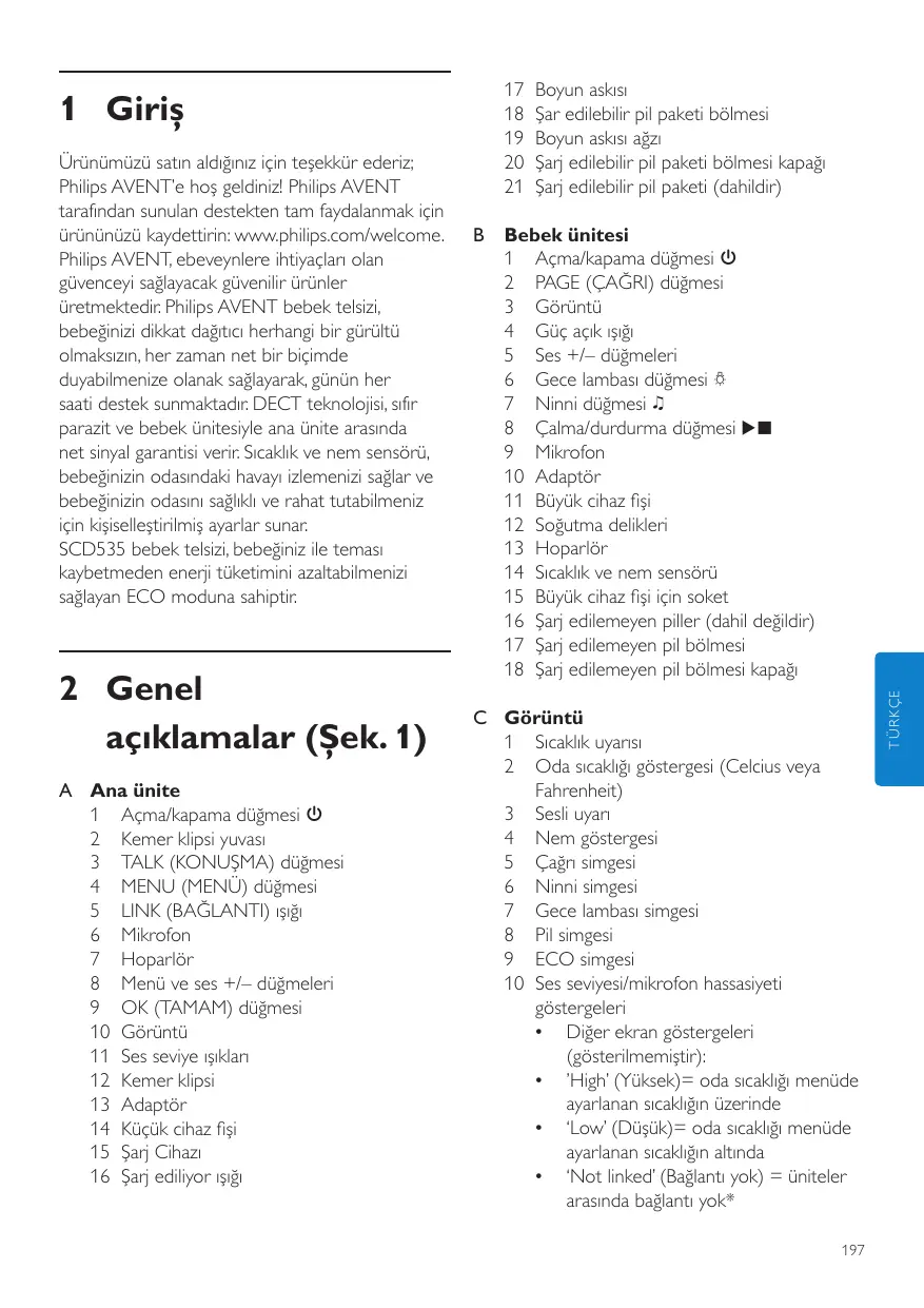 Ürünümüzü satın aldığınız için teşekkür ederiz; Philips AVENT’e hoş geldiniz! Philips AVENT tarafından sunulan destekten tam faydalanmak için ürününüzü kaydettirin: www.philips.com/welcome. Philips AVENT, ebeveynlere ihtiyaçları olan güvenceyi sağlayacak güvenilir ürünler üretmektedir. Philips AVENT bebek telsizi, bebeğinizi dikkat dağıtıcı herhangi bir gürültü olmaksızın, her zaman net bir biçimde duyabilmenize olanak sağlayarak, günün her saati destek sunmaktadır. DECT teknolojisi, sıfır parazit ve bebek ünitesiyle ana ünite arasında net sinyal garantisi verir. Sıcaklık ve nem sensörü, bebeğinizin odasındaki havayı izlemenizi sağlar ve bebeğinizin odasını sağlıklı ve rahat tutabilmeniz için kişiselleştirilmiş ayarlar sunar. SCD535 bebek telsizi, bebeğiniz ile teması kaybetmeden enerji tüketimini azaltabilmenizi sağlayan ECO moduna sahiptir. 2 Genel açıklamalar (Şek. 1) A Ana ünite 1 Açma/kapama düğmesi 3 2 Kemer klipsi yuvası 3 TALK (KONUŞMA) düğmesi 4 MENU (MENÜ) düğmesi 5 LINK (BAĞLANTI) ışığı 6 Mikrofon 7 Hoparlör 8 Menü ve ses +/– düğmeleri 9 OK (TAMAM) düğmesi 10 Görüntü 11 Ses seviye ışıkları 12 Kemer klipsi 13 Adaptör 14 Küçük cihaz fişi 15 Şarj Cihazı 16 Şarj ediliyor ışığı