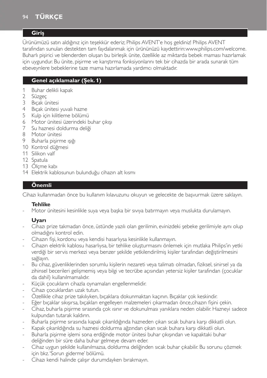 Buhar delikli kapak Süzgeç Bıçak ünitesi Bıçak ünitesi yuvalı hazne Kulp için kilitleme bölümü Motor ünitesi üzerindeki buhar çıkışı Su haznesi doldurma deliği Motor ünitesi Buharla pişirme ışığı Kontrol düğmesi Silikon valf Spatula Ölçme kabı Elektrik kablosunun bulunduğu cihazın alt kısmı Önemli Cihazı kullanmadan önce bu kullanım kılavuzunu okuyun ve gelecekte de başvurmak üzere saklayın. Tehlike -- Motor ünitesini kesinlikle suya veya başka bir sıvıya batırmayın veya muslukta durulamayın. Uyarı -- Cihazı prize takmadan önce, üstünde yazılı olan gerilimin, evinizdeki şebeke gerilimiyle aynı olup olmadığını kontrol edin. -- Cihazın fişi, kordonu veya kendisi hasarlıysa kesinlikle kullanmayın. -- Cihazın elektrik kablosu hasarlıysa, bir tehlike oluşturmasını önlemek için mutlaka Philips’in yetki verdiği bir servis merkezi veya benzer şekilde yetkilendirilmiş kişiler tarafından değiştirilmesini sağlayın. -- Bu cihaz, güvenliklerinden sorumlu kişilerin nezareti veya talimatı olmadan, fiziksel, sinirsel ya da zihinsel becerileri gelişmemiş veya bilgi ve tecrübe açısından yetersiz kişiler tarafından (çocuklar da dahil) kullanılmamalıdır. -- Küçük çocukların cihazla oynamaları engellenmelidir. -- Cihazı çocuklardan uzak tutun. -- Özellikle cihaz prize takılıyken, bıçaklara dokunmaktan kaçının. Bıçaklar çok keskindir. -- Eğer bıçaklar sıkışırsa, bıçakları engelleyen malzemeleri çıkarmadan önce,cihazın fişini çekin. -- Cihaz, buharla pişirme sırasında çok ısınır ve dokunulması yanıklara neden olabilir. Hazneyi sadece kulpundan tutarak kaldırın. -- Buharla pişirme sırasında kapak çıkarıldığında hazneden çıkan sıcak buhara karşı dikkatli olun. -- Kapak çıkarıldığında su haznesi doldurma ağzından çıkan sıcak buhara karşı dikkatli olun. -- Buharla pişirme işlemi sona erdiğinde motor ünitesi buhar çıkışından ve kapaktaki buhar deliğinden bir süre daha buhar gelmeye devam eder. -- Cihaz uygun şekilde kullanılmazsa, doldurma deliğinden sıcak buhar çıkabilir. Bu sorunu çözmek için bkz. ‘Sorun giderme’ bölümü. -- Cihazı kendi halinde çalışır durumdayken bırakmayın. Türkçe 95 Dikkat -- Başka firmalarca üretilmiş olan veya Philips’in özellikle önermediği aksesuar ve parçaları kesinlikle kullanmayın. Bu gibi parçaları kullandığınız takdirde garantiniz geçersiz sayılacaktır. -- Cihazı çalışan veya soğumamış olan ocak veya fırının üzerine veya yakınına koymayın. -- Herhangi bir parçayı takmadan, çıkarmadan veya temizlemeden önce cihazın fişini mutlaka prizden çekin. -- Cihazı temizlemeden önce, her zaman fişini prizden çekin ve soğumaya bırakın. -- Hazne veya cihazın başka bir parçasını mikrodalgada kullanmayın, haznenin sapının ve bıçak ünitesinin metal parçaları bu tür kullanım için uygun değildir. -- Hazne veya cihazın başka bir parçasını sterilizasyon cihazında veya mikrodalgada sterilize etmeyin, haznenin sapının ve bıçak ünitesinin metal parçaları bu tür kullanım için uygun değildir. -- Bu cihaz yalnızca evde kullanıma yöneliktir. Cihazın uygun olmayan şekillerde, profesyonel ya da yarı profesyonel amaçlarla veya kullanım talimatlarına uygun olmayan şekillerde kullanılması durumunda, garanti geçerliliğini yitirecek ve Philips söz konusu zararla ilgili olarak her türlü sorumluluğu reddedecektir. -- Cihazı sabit, yatay ve düz bir yüzeye yerleştirin. Cihaz kullanılırken sıcak buhar yaydığından, zarar görmemeleri için dolaplar ve diğer nesnelerle arada yeterli boş alan bulunduğundan emin olun. -- Cihaz düşmüş veya herhangi bir şekilde zarar görmüşse kullanmayın. Onarım için yetkili Philips servisine götürün. -- Buharla pişirme fonksiyonunu kesinlikle susuz kullanmayın. -- Su haznesini aşırı doldurmayın (maks. 200 ml). Ölçme kabında gösterilen maksimum seviyeyi aşmayın. -- Malzemeleri buharla pişirirken, hazneyi aşırı doldurmadığınızdan emin olun. Yeşil bıçak ünitesinin üst kenarının yiyecekle kaplı olmadığından emin olun. -- Sıvıları karıştırırken, haznede belirtilen maksimum seviyeyi aşmayın (450 ml). -- Çalışırken cihazı kaldırmayın veya hareket ettirmeyin. -- Doldurma deliğine veya buhar valfine herhangi bir nesne sokmayın. -- Buharla pişirme sırasında hazneye kesinlikle su doldurmayın, cihazdan sıcak su veya buhar gelebilir. -- Buharla pişirmeden sonra gerekirse, malzemeleri karıştırmak için cihazı açmadan önce kapağın soğuduğundan emin olun. -- Tehlikeli bir durum yaratmamak için bu cihazı zamanlayıcı düğmesine veya uzaktan kumanda sistemine bağlamayın. -- Bebeğinizi beslemeden önce mamanın sıcaklığını mutlaka elinizin üstüyle kontrol edin. -- Mamanın kıvamını mutlaka kontrol edin. Mamada topaklanma olmadığından emin olun. -- Buharla pişirme işlemi (maksimum 20 dakika) tamamlandıktan sonra bebek mamasını tekrar buharla pişirmeyin ve ısıtmayın. -- Mamayı hazneden almak için sadece birlikte verilen spatulayı kullanın. -- Düzenli olarak kireç çözme uygulanması cihazın bozulmasını önler. -- Gürültü seviyesi: Lc= 89 dB(A). Güvenlik sistemi Cihazda dahili güvenlik sistemi bulunmaktadır. Cihaz yalnızca motor ünitesinin tüm parçaları düzgün olarak takıldığında çalışır. Tüm parçalar düzgün takılmışsa, dahili kilit devre dışı kalacaktır. Cihazda aşırı ısınma koruması bulunmaktadır. İki buharla pişirme işlemi arasındaki sürenin çok kısa olması, buharla pişirme fonksiyonunun çok uzun süre kullanılması veya haznede çok fazla malzeme olması durumunda aşırı ısınma söz konusu olabilir. Kullanım sırasında cihazın aşırı ısınma fonksiyonu tarafından kapatılması halinde kontrol düğmesini 0 konumuna get