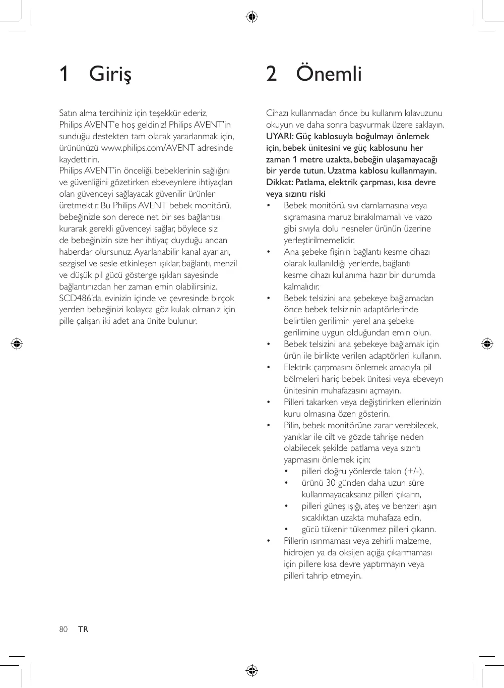 - Pilleri değiştirecekseniz, bu kullanım kılavuzunda belirtilen türde piller kullanın. Bir ünitedeki bütün pilleri aynı zamanda değiştirin. Elektromanyetik alanlar (EMF) Bu Philips AVENT bebek monitörü elektromanyetik alanlarla (EMF) ilgili tüm standartlara uygundur. Düzgün bir şekilde ve bu kullanım kılavuzundaki talimatlara uygun olarak kullanılırsa, cihazın kullanımı günümüz bilimsel bulgularına göre güvenlidir. Ürünün geri dönüşümü Bebek monitörünüz geri dönüştürülebilen ve yeniden kullanılabilen yüksek kaliteli malzeme ve bileşenler kullanılarak üretilmiştir. Ürünü ve ambalajı uygun şekilde atarak çevreyi korumaya yardımcı olun. Üzerinde çarpı bulunan çöp kutusu simgesi, bebek monitörünün 2002/96/EC sayılı Avrupa Direktifi ile denetlendiğini, bu sebeple ürün ve piller, çevreye ve sağlığa zarar verebilecek maddeler içerdiği için ev atıklarıyla birlikte atılmamalıdır. Bebek monitörünü ve pilleri atarken, lütfen belirlenen toplama bölgelerini ve geri dönüşüm tesislerini kullanın.