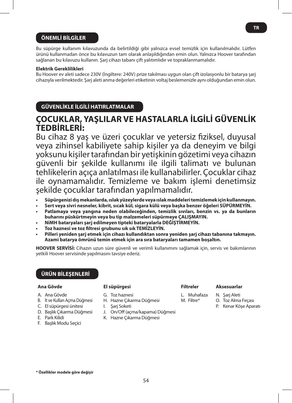 TR HOOVER YEDEK PARÇA VE SARF MALZEMELERİ Parçaları daima orijinal Hoover parçaları ile değiştirin. Bu parçaları Hoover servislerinden tedarik edebilirsiniz. Parça siparişi verirken mutlaka cihazın model numarasını belirtin. ÖNEMLİ: &&The battery in this cleaner is guaranteed for 6 months from purchase.&& &&After 6 months the customer is liable for the cost of a new battery which will be fitted free of charge by an authorised Hoover engineer.&& Saf Malzemeleri • •