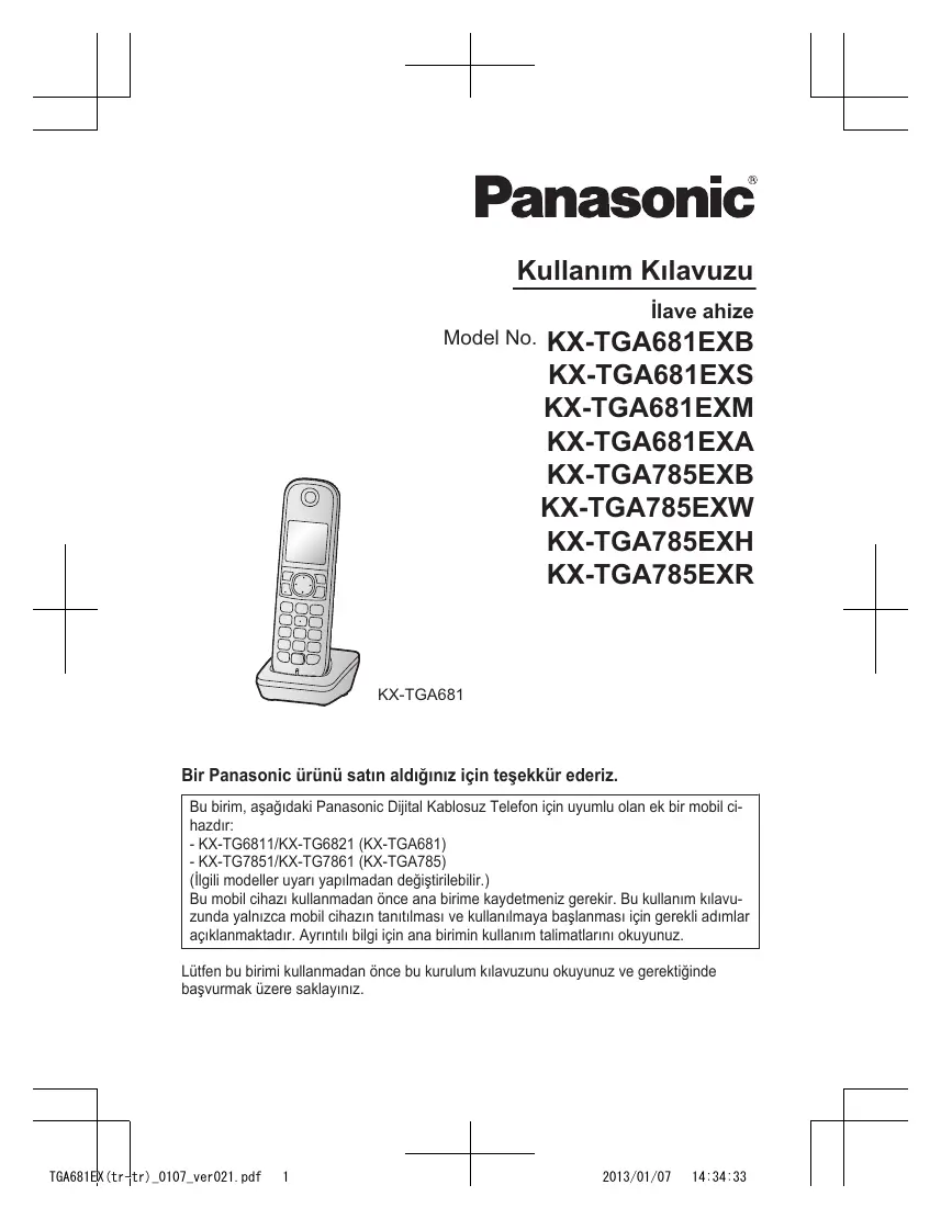 2012/12/06 12:18:26 Kullanım Kılavuzu İlave ahize Model No. KX-TGA681EXB KX-TGA681EXS KX-TGA681EXM KX-TGA681EXA KX-TGA785EXB KX-TGA785EXW KX-TGA785EXH KX-TGA785EXR KX-TGA681 Bir Panasonic ürünü satın aldığınız için teşekkür ederiz. Bu birim, aşağıdaki Panasonic Dijital Kablosuz Telefon için uyumlu olan ek bir mobil cihazdır: - KX-TG6811/KX-TG6821 (KX-TGA681) - KX-TG7851/KX-TG7861 (KX-TGA785) (İlgili modeller uyarı yapılmadan değiştirilebilir.) Bu mobil cihazı kullanmadan önce ana birime kaydetmeniz gerekir. Bu kullanım kılavuzunda yalnızca mobil cihazın tanıtılması ve kullanılmaya başlanması için gerekli adımlar açıklanmaktadır. Ayrıntılı bilgi için ana birimin kullanım talimatlarını okuyunuz. Lütfen bu birimi kullanmadan önce bu kurulum kılavuzunu okuyunuz ve gerektiğinde başvurmak üzere saklayınız. TGA681EX(tr-tr)_0107_ver021.pdf