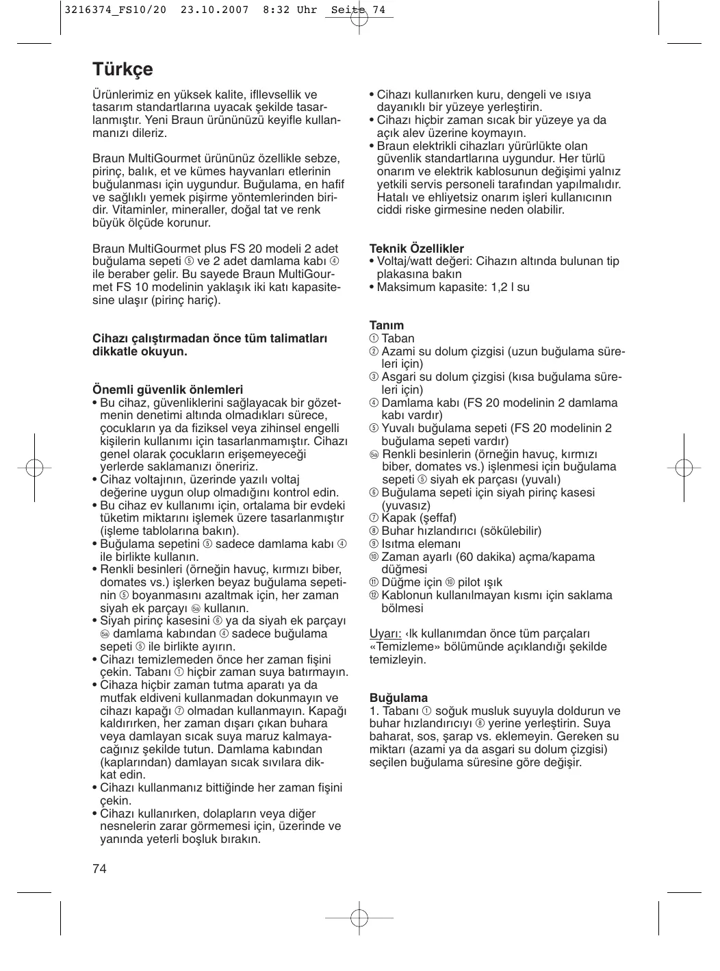 8:32 Uhr Seite 74 Türkçe Ürünlerimiz en yüksek kalite, ifllevsellik ve tasarım standartlarına uyacak µekilde tasarlanmıµtır. Yeni Braun ürününüzü keyifle kullanmanızı dileriz. Braun MultiGourmet ürününüz özellikle sebze, pirinç, balık, et ve kümes hayvanları etlerinin buπulanması için uygundur. Buπulama, en hafif ve saπlıklı yemek piµirme yöntemlerinden biridir. Vitaminler, mineraller, doπal tat ve renk büyük ölçüde korunur. Braun MultiGourmet plus FS 20 modeli 2 adet buπulama sepeti 5 ve 2 adet damlama kabı 4 ile beraber gelir. Bu sayede Braun MultiGourmet FS 10 modelinin yaklaµık iki katı kapasitesine ulaµır (pirinç hariç). Cihazı çalıµtırmadan önce tüm talimatları dikkatle okuyun. Önemli güvenlik önlemleri