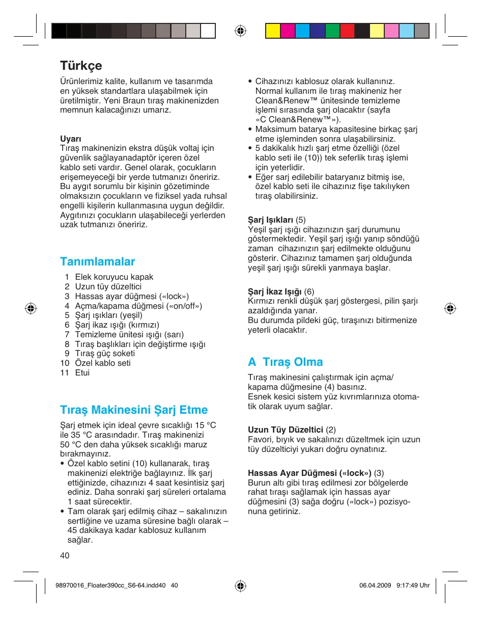 _| REC + Co Con | Türkçe Ürünlerimiz kalite, kullanim ve tasarimda en yüksek standartlara ulaçabilmek için üretilmistir. Yeni Braun tira$ makinenizden memnun Kalacaÿinizi umarz. Uyan Tirag makinenizin ekstra düsük voltaj için güveniik saÿlayanadaptr içeren ôzel kablo seti vardir. Genel olarak, çocuklarin erisemeyecedi bir yerde tutmanizi ôneririz. Bu aygit sorumlu bir kiginin gôzetiminde olmaksizin çocuklarin ve fiziksel yada ruhsal engelli kisilerin kullanmasina uygun debildir. Aygitinizi çocuklarin ulaçabileceüi yererden uzak tutmanizi ôneririz. Tanimlamalar Elek koruyucu kapak Uzun tüy düzeltici Hassas ayar dügmesi («lock») Açma/kapama dügmesi («on/off») Sa isiklani (yesil) Sa ikaz 1s1d1 (kirmiz1) Temizleme ünitesi 11ÿ1 (sari) Tiras basliklari için degistirme 1$1ÿ1 Tiras güç soketi Ôzel kablo seti Etui ECECRECENLE Tiras Makinesini Sarj Etme Sarj etmek için ideal çevre sicakhgi 15 °C ile 35 °C arasindadir. Tiras makinenizi 50 °C den daha yüksek sicakliÿi maruz birakmayinez. + Üzel kablo setini (10) kullanarak, trras inenizi elektrige baÿlayiniz. ÎIk sarj izde, cihaziniz1 4 saat kesintisiz sarj ediniz. Daha sonraki sarj süreleri ortalama 1 saat sürecektir. Jarak sarj edilmis cihaz — sakalinizin ne ve uzama süresine baëli olarak — 45 dakikaya kadar kablosuz kullanim saÿlar.