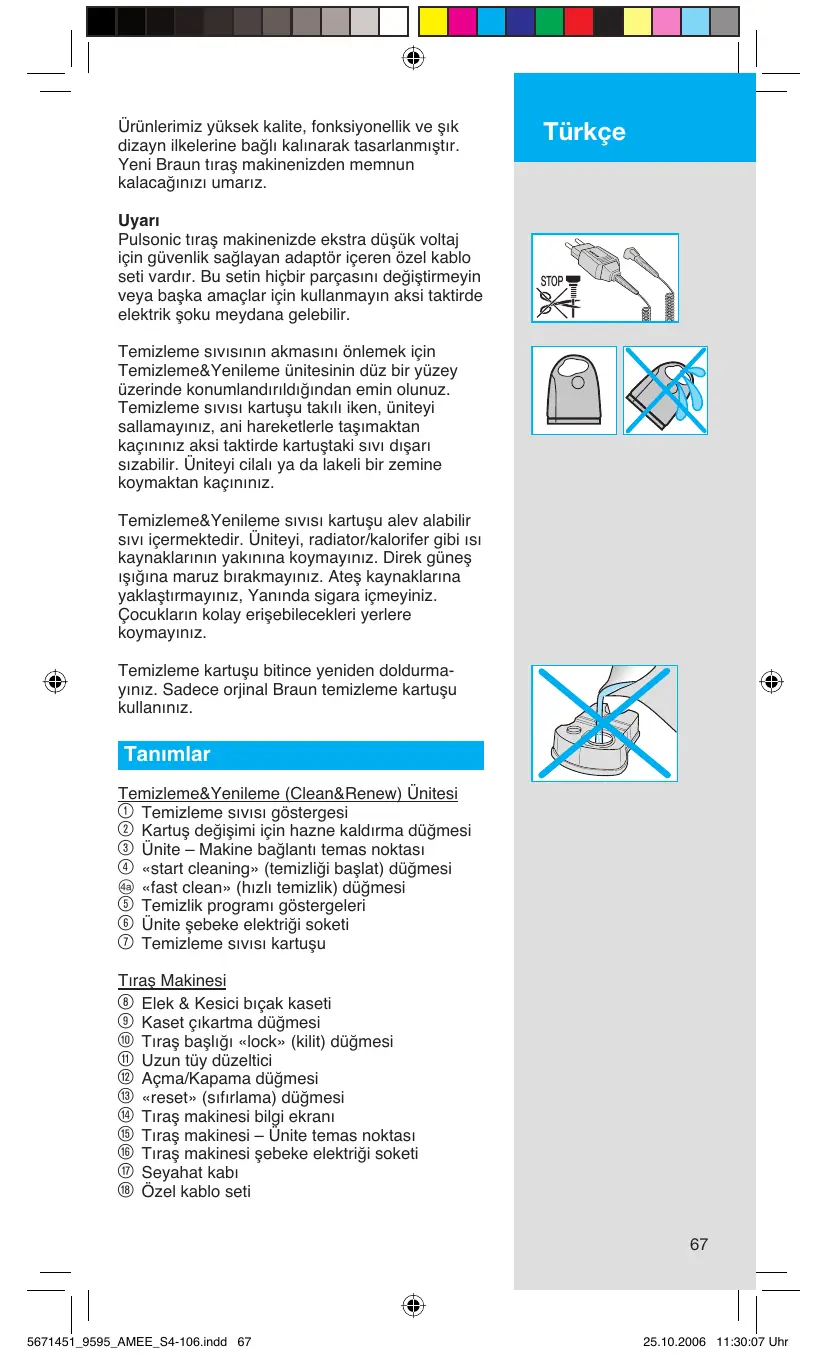 Ürünlerimiz yüksek kalite, fonksiyonellik ve şık dizayn ilkelerine bağlı kalınarak tasarlanmıştır. Yeni Braun tıraş makinenizden memnun kalacağınızı umarız. Uyarı Pulsonic tıraş makinenizde ekstra düşük voltaj için güvenlik sağlayan adaptör içeren özel kablo seti vardır. Bu setin hiçbir parçasını değiştirmeyin veya başka amaçlar için kullanmayın aksi taktirde elektrik şoku meydana gelebilir. Türkçe STOP Temizleme sıvısının akmasını önlemek için Temizleme&Yenileme ünitesinin düz bir yüzey üzerinde konumlandırıldığından emin olunuz. Temizleme sıvısı kartuşu takılı iken, üniteyi sallamayınız, ani hareketlerle taşımaktan kaçınınız aksi taktirde kartuştaki sıvı dışarı sızabilir. Üniteyi cilalı ya da lakeli bir zemine koymaktan kaçınınız. Temizleme&Yenileme sıvısı kartuşu alev alabilir sıvı içermektedir. Üniteyi, radiator/kalorifer gibi ısı kaynaklarının yakınına koymayınız. Direk güneş ışığına maruz bırakmayınız. Ateş kaynaklarına yaklaştırmayınız, Yanında sigara içmeyiniz. Çocukların kolay erişebilecekleri yerlere koymayınız. Temizleme kartuşu bitince yeniden doldurmayınız. Sadece orjinal Braun temizleme kartuşu kullanınız. Tanımlar Temizleme&Yenileme (Clean&Renew) Ünitesi 1 Temizleme sıvısı göstergesi 2 Kartuş değişimi için hazne kaldırma düğmesi 3 Ünite – Makine bağlantı temas noktası 4 «start cleaning» (temizliği başlat) düğmesi D «fast clean» (hızlı temizlik) düğmesi 5 Temizlik programı göstergeleri 6 Ünite şebeke elektriği soketi 7 Temizleme sıvısı kartuşu Tıraş Makinesi 8 Elek & Kesici bıçak kaseti 9 Kaset çıkartma düğmesi 0 Tıraş başlığı «lock» (kilit) düğmesi q Uzun tüy düzeltici w Açma/Kapama düğmesi e «reset» (sıfırlama) düğmesi r Tıraş makinesi bilgi ekranı t Tıraş makinesi – Ünite temas noktası z Tıraş makinesi şebeke elektriği soketi u Seyahat kabı i Özel kablo seti