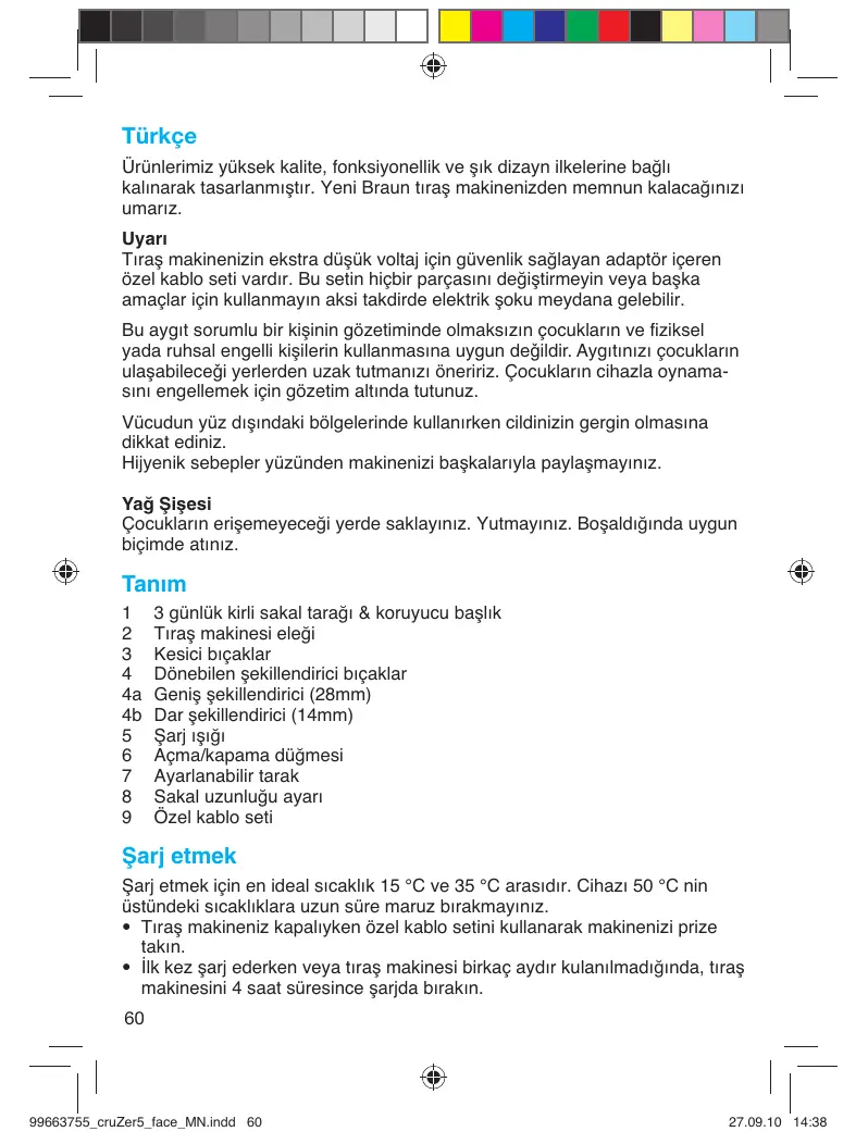 Türkçe Ürünlerimiz yüksek kalite, fonksiyonellik ve şık dizayn ilkelerine bağlı kalınarak tasarlanmıştır. Yeni Braun tıraş makinenizden memnun kalacağınızı umarız. Uyarı Tıraş makinenizin ekstra düşük voltaj için güvenlik sağlayan adaptör içeren özel kablo seti vardır. Bu setin hiçbir parçasını değiştirmeyin veya başka amaçlar için kullanmayın aksi takdirde elektrik şoku meydana gelebilir. Bu aygıt sorumlu bir kiμinin gözetiminde olmaksızın çocukların ve fiziksel yada ruhsal engelli kiμilerin kullanmasına uygun de©ildir. Aygıtınızı çocukların ulaμabilece©i yerlerden uzak tutmanızı öneririz. Çocukların cihazla oynamasını engellemek için gözetim altında tutunuz. Vücudun yüz dışındaki bölgelerinde kullanırken cildinizin gergin olmasına dikkat ediniz. Hijyenik sebepler yüzünden makinenizi başkalarıyla paylaşmayınız. Yağ Şişesi Çocukların erişemeyeceği yerde saklayınız. Yutmayınız. Boşaldığında uygun biçimde atınız. Tanım