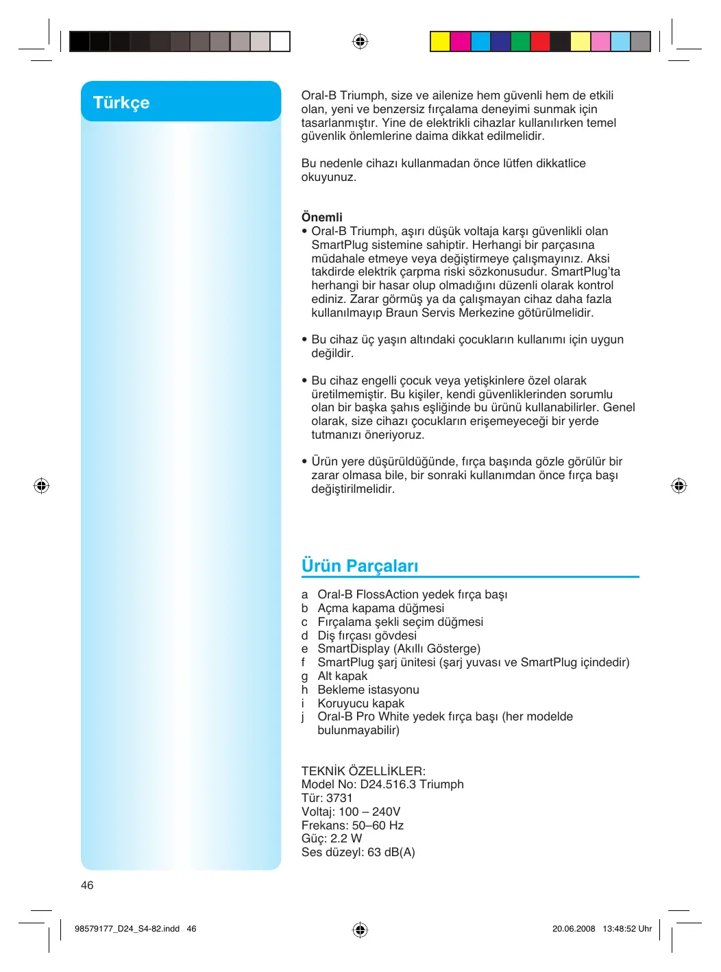 Türkçe Oral-B Triumph, size ve ailenize hem güvenli hem de etkili olan, yeni ve benzersiz fırçalama deneyimi sunmak için tasarlanmıştır. Yine de elektrikli cihazlar kullanılırken temel güvenlik önlemlerine daima dikkat edilmelidir. Bu nedenle cihazı kullanmadan önce lütfen dikkatlice okuyunuz. Önemli