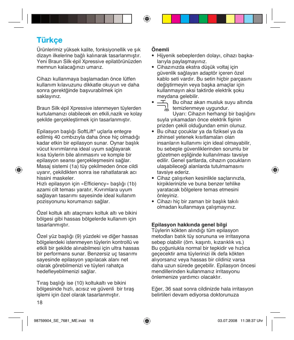 Türkçe Ürünlerimiz yüksek kalite, fonksiyonellik ve şık dizayn ilkelerine bağlı kalınarak tasarlanmıştır. Yeni Braun Silk·épil Xpressive epilatörünüzden memnun kalacağınızı umarız. Cihazı kullanmaya başlamadan önce lütfen kullanım kılavuzunu dikkatle okuyun ve daha sonra gerektğinde başvurabilmek için saklayınız. Braun Silk·épil Xpressive istenmeyen tüylerden kurtulamanızı olabilecek en etkili,nazik ve kolay şekilde gerçekleştirmek için tasarlanmıştır. Epilasyon başlığı SoftLift® uçlarla entegre edilmiş 40 cımbızıyla daha önce hiç olmadığı kadar etkin bir epilasyon sunar. Oynar başlık vücut kıvrımlarına ideal uyum sağlayarak kısa tüylerin bile alınmasını ve komple bir epilasyon seansı gerçekleşmesini sağlar. Masaj sistemi (1a) tüy çekilmeden önce cildi uyarır, çekildikten sonra ise rahatlatarak acı hissini maskeler. Hızlı epilasyon için «Efficiency» başlığı (1b) azami cilt teması yaratır, Kıvrımlara uyum sağlayan tasarımı sayesinde ideal kullanım pozisyonunu korumanızı sağlar. Özel koltuk altı ataçmanı koltuk altı ve bikini bölgesi gibi hassas bölgelerde kullanım için tasarlanmıştır. Özel yüz başlığı (9) yüzdeki ve diğer hassas bölgelerdeki istenmeyen tüylerin kontrollü ve etkili bir şekilde alınabilmesi için ultra hassas bir performans sunar. Benzersiz uç tasarımı sayesinde epilasyon yapılacak alanı net olarak görebilmenizi ve tüyleri rahatça hedefleyebilmenizi sağlar. Tıraş başlığı ise (10) koltukaltı ve bikini bölgesinde hızlı, acısız ve güvenli bir tıraş işlemi için özel olarak tasarlanmıştır. Önemli