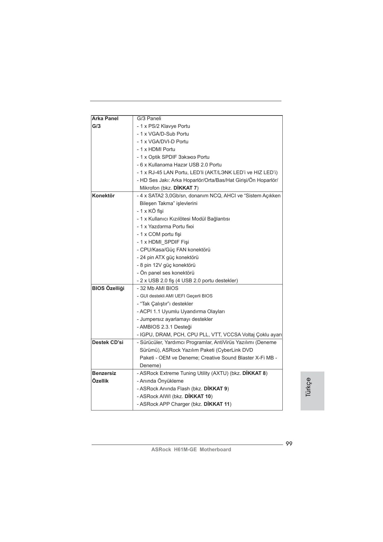 ASRock H61M-GE Motherboard Konektör BIOS Özelliği Destek CD’si Benzersiz Özellik G/З Paneli - 1 x PS/2 Klavye Portu - 1 x VGA/D-Sub Portu - 1 x VGA/DVI-D Portu - 1 x HDMI Portu - 1 x Optik SPDIF Зэkэюэ Portu - 6 x Kullanэma Hazэr USB 2.0 Portu - 1 x RJ-45 LAN Portu, LED’li (AKT/LЭNK LED’i ve HIZ LED’i) - HD Ses Jakı: Arka Hoparlör/Orta/Bas/Hat Girişi/Ön Hoparlör/ Mikrofon (bkz. DİKKAT 7) - 4 x SATA2 3,0Gb/sn, donanım NCQ, AHCI ve “Sistem Açıkken Bileşen Takma” işlevlerini - 1 x KÖ fişi - 1 x Kullanıcı Kızılötesi Modül Bağlantısı - 1 x Yazdэrma Portu fiюi - 1 x COM portu fişi - 1 x HDMI_SPDIF Fişi - CPU/Kasa/Güç FAN konektörü - 24 pin ATX güç konektörü - 8 pin 12V güç konektörü - Ön panel ses konektörü - 2 x USB 2.0 fiş (4 USB 2.0 portu destekler) - 32 Mb AMI BIOS - GUI destekli AMI UEFI Geçerli BIOS - “Tak Çalıştır”ı destekler - ACPI 1.1 Uyumlu Uyandırma Olayları - Jumpersız ayarlamayı destekler - AMBIOS 2.3.1 Desteği - IGPU, DRAM, PCH, CPU PLL, VTT, VCCSA Voltaj Çoklu ayarı - Sürücüler, Yardımcı Programlar, AntiVirüs Yazılımı (Deneme Sürümü), ASRock Yazılım Paketi (CyberLink DVD Paketi - OEM ve Deneme; Creative Sound Blaster X-Fi MB Deneme) - ASRock Extreme Tuning Utility (AXTU) (bkz. DİKKAT 8) - Anında Önyükleme - ASRock Anında Flash (bkz. DİKKAT 9) - ASRock AIWI (bkz. DİKKAT 10) - ASRock APP Charger (bkz. DİKKAT 11) ASRock H61M-GE Motherboard Türkçe Arka Panel G/З