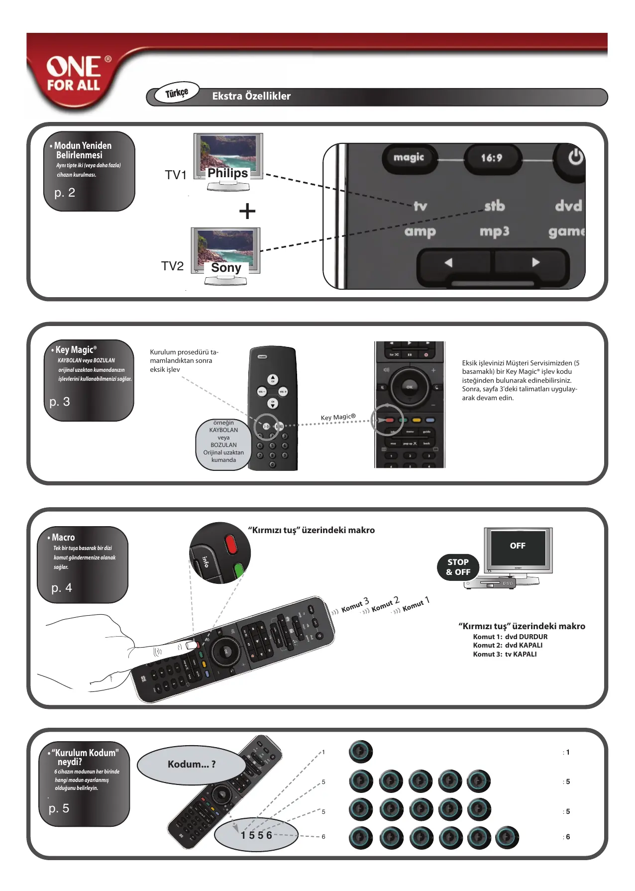 Key Magic® KeyMagic® özel bir ONE FOR ALL özelliğidir. ONE FOR ALL orijinal uzaktan kumandanızın pek çok işlevinin, hatta ONE FOR ALL tuştakımında ayrı bir tuşu olmayan işlevlerinin bile çalıştırılmasını sağlar. Sık kullanılan işlevler ONE FOR ALL kumandanızın KeyMagic® özelliğini kullanarak istediğiniz bir tuşa atanabilir. KeyMagic® ile belirli bir işlevi programlamak için ilgili işlev kodunu bilmeniz gerekir. İşlev kodları farklı cihaz tiplerine göre değiştiğinden, kılavuzda yer almamaktadırlar. İşlev kodlarını tüketici servisi yardım hattından mektup, faks veya e-posta ile isteyebilirsiniz.