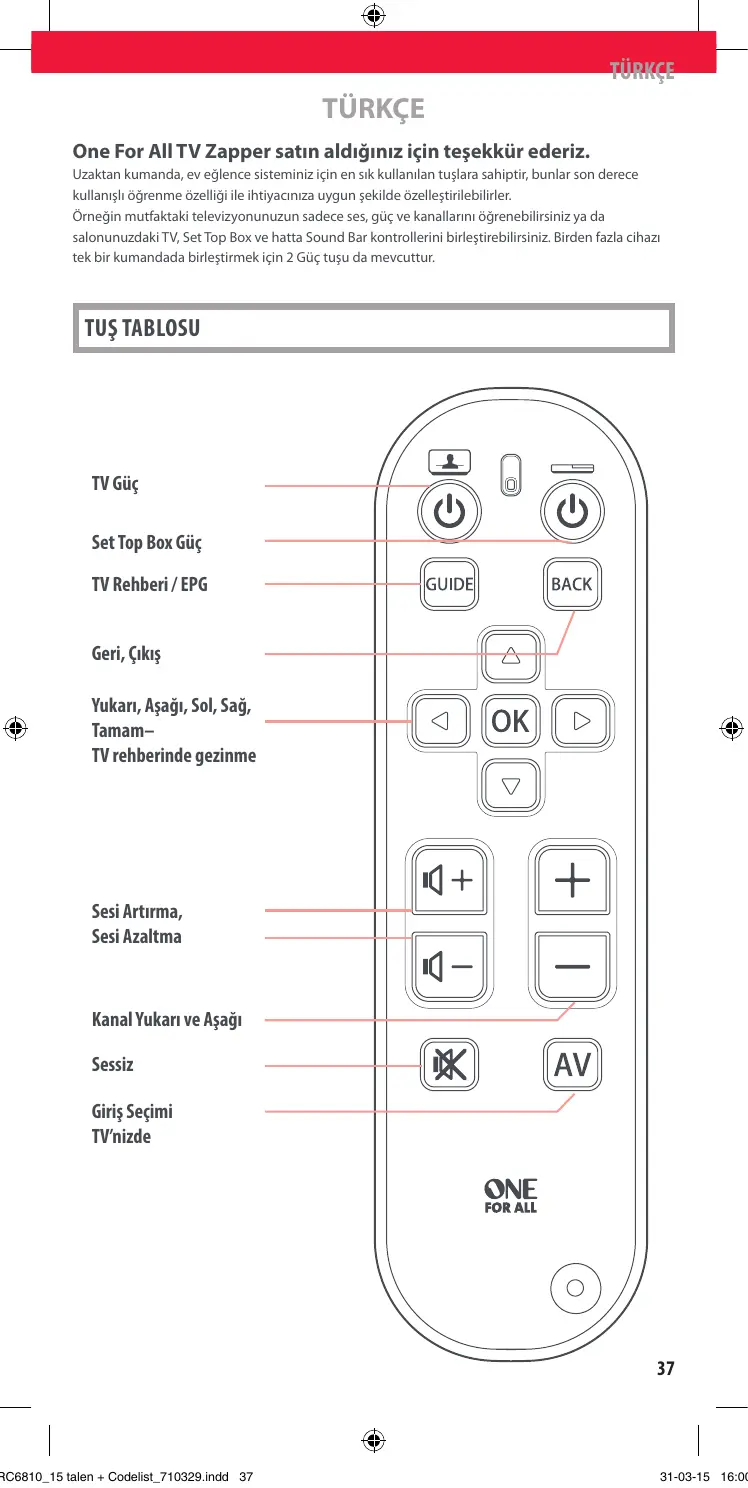 TÜRKÇE TÜRKÇE One For All TV Zapper satın aldığınız için teşekkür ederiz. Uzaktan kumanda, ev eğlence sisteminiz için en sık kullanılan tuşlara sahiptir, bunlar son derece kullanışlı öğrenme özelliği ile ihtiyacınıza uygun şekilde özelleştirilebilirler. Örneğin mutfaktaki televizyonunuzun sadece ses, güç ve kanallarını öğrenebilirsiniz ya da salonunuzdaki TV, Set Top Box ve hatta Sound Bar kontrollerini birleştirebilirsiniz. Birden fazla cihazı tek bir kumandada birleştirmek için 2 Güç tuşu da mevcuttur.