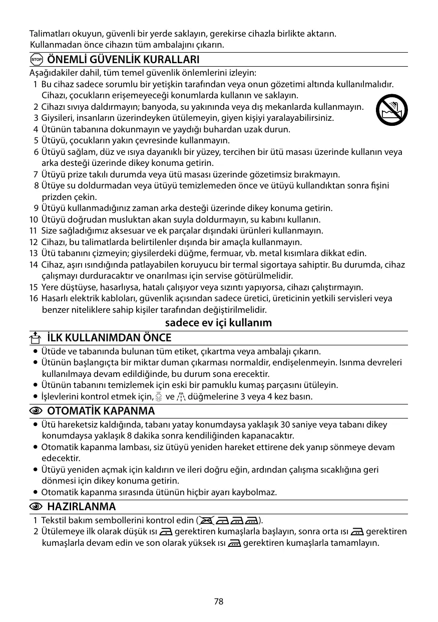 A ÖNEMLİ GÜVENLİK KURALLARI Aşağıdakiler dahil, tüm temel güvenlik önlemlerini izleyin: 1 Bu cihaz sadece sorumlu bir yetişkin tarafından veya onun gözetimi altında kullanılmalıdır. Cihazı, çocukların erişemeyeceği konumlarda kullanın ve saklayın. 2 Cihazı sıvıya daldırmayın; banyoda, su yakınında veya dış mekanlarda kullanmayın. 3 Giysileri, insanların üzerindeyken ütülemeyin, giyen kişiyi yaralayabilirsiniz. 4 Ütünün tabanına dokunmayın ve yaydığı buhardan uzak durun. 5 Ütüyü, çocukların yakın çevresinde kullanmayın. 6 Ütüyü sağlam, düz ve ısıya dayanıklı bir yüzey, tercihen bir ütü masası üzerinde kullanın veya arka desteği üzerinde dikey konuma getirin. 7 Ütüyü prize takılı durumda veya ütü masası üzerinde gözetimsiz bırakmayın. 8 Ütüye su doldurmadan veya ütüyü temizlemeden önce ve ütüyü kullandıktan sonra fişini prizden çekin. 9 Ütüyü kullanmadığınız zaman arka desteği üzerinde dikey konuma getirin. 10 Ütüyü doğrudan musluktan akan suyla doldurmayın, su kabını kullanın. 11 Size sağladığımız aksesuar ve ek parçalar dışındaki ürünleri kullanmayın. 12 Cihazı, bu talimatlarda belirtilenler dışında bir amaçla kullanmayın. 13 Ütü tabanını çizmeyin; giysilerdeki düğme, fermuar, vb. metal kısımlara dikkat edin. 14 Cihaz, aşırı ısındığında patlayabilen koruyucu bir termal sigortaya sahiptir. Bu durumda, cihaz çalışmayı durduracaktır ve onarılması için servise götürülmelidir. 15 Yere düştüyse, hasarlıysa, hatalı çalışıyor veya sızıntı yapıyorsa, cihazı çalıştırmayın. 16 Hasarlı elektrik kabloları, güvenlik açısından sadece üretici, üreticinin yetkili servisleri veya benzer niteliklere sahip kişiler tarafından değiştirilmelidir.