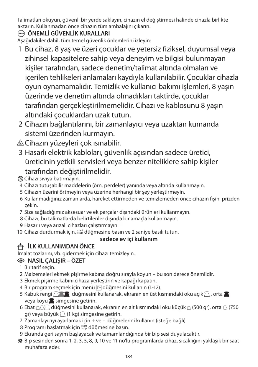 C PROGRAMLAR 1 temel (basic) Temel beyaz ekmek veya beyaz ekmek hamuruna dayalı tarifler için. 2 Fransız (French) Daha hafif dokulu ve daha gevrek kabuklu Fransız tipi ekmekler için. Bu programa uygun tarifler normalde tereyağı (veya margarin) veya süt kullanmazlar. Sadece birkaç saat taze kalacaktır. 3 tam buğday/tam tahıl (wholewheat/wholemeal) Daha yoğun olan un, yoğurma öncesinde yaklaşık 30 dakika ön-ısıtma gerektirir. Somunlar daha küçük ve yoğun olurlar. Zamanlayıcı kullanımına pek uygun değildir. 4 kek (cake) Hamurdan çok, kabartma maddesi olarak genellikle -maya yerine- kabartma tozu veya karbonat kullanan kek ve sulu hamur tarifleri için. 5 tatlı (sweet) Genellikle meyve veya kuru meyve içeren tatlı ekmek tarifleri için. 6 hamur (dough) Bu programda cihaz, bir karıştırma/yoğurma makinesi olarak kullanılacaktır. Hamuru cihazdan program biter bitmez çıkarın. Tekrar yoğurun, üzerini örtün ve kesmeden/şekil vermeden önce yaklaşık on dakika dinlenmesine izin verin. 7 reçel (jam) Bu programda malzemeler önceden ısıtılacak ve daha sonra kaynatılacaktır. Reçelin kaynama sırasındaki genleşmesi için bol miktarda yer ayırın. Temizlenmesi güç olacağından, reçelin cihaza yayılmamasına dikkat edin. , Dikkatli olun – sıcak reçel ciddi düzeyde yanıklara neden olabilir. 8 sandviç (sandwich) Bu program, sandviçler için ideal olan hafif dokulu ve ince kabuklu bir ekmek somunu yapar. 9 glütensiz (gluten-free) Glütensiz ekmek, hamura gözenekli ve esnek bir yapı vermek için diğer maddelerden yararlanır. Ekmek daha yoğun ve güçlendirilmiş unla yapılan ekmeklerden daha kaba yapılıdır. 187